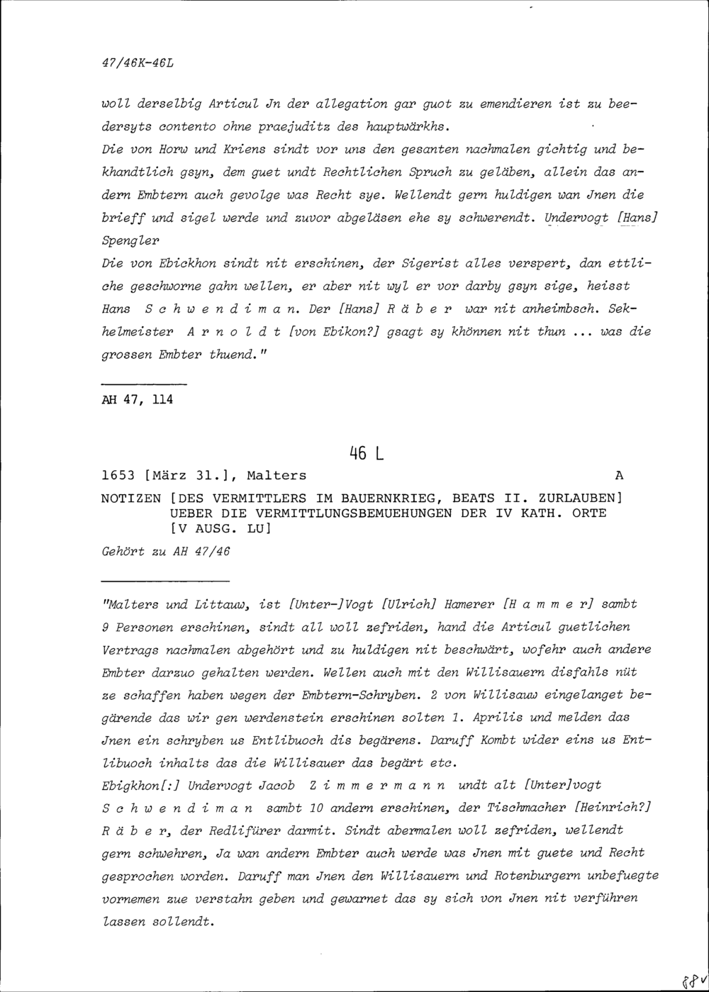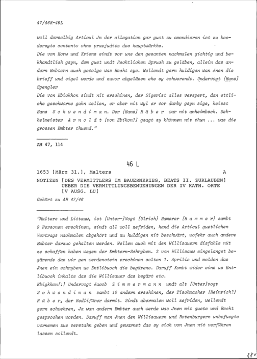 Notiz von Beat II. Zurlauben, Vermittler im Bauernkrieg über die Vermittlungsbemühungen...