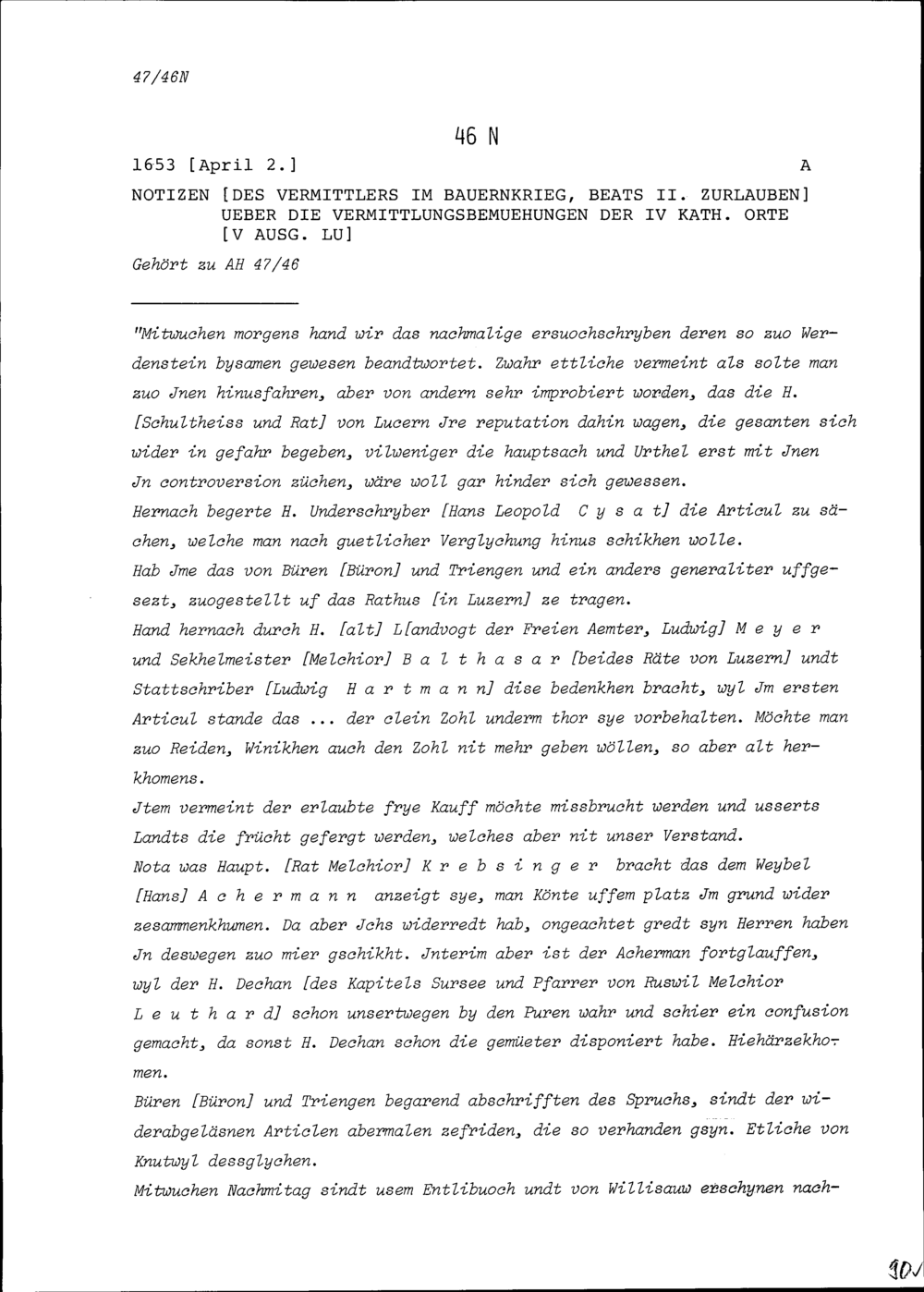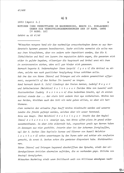 Notiz von Beat II. Zurlauben, Vermittler im Bauernkrieg über die Vermittlungsbemühungen...