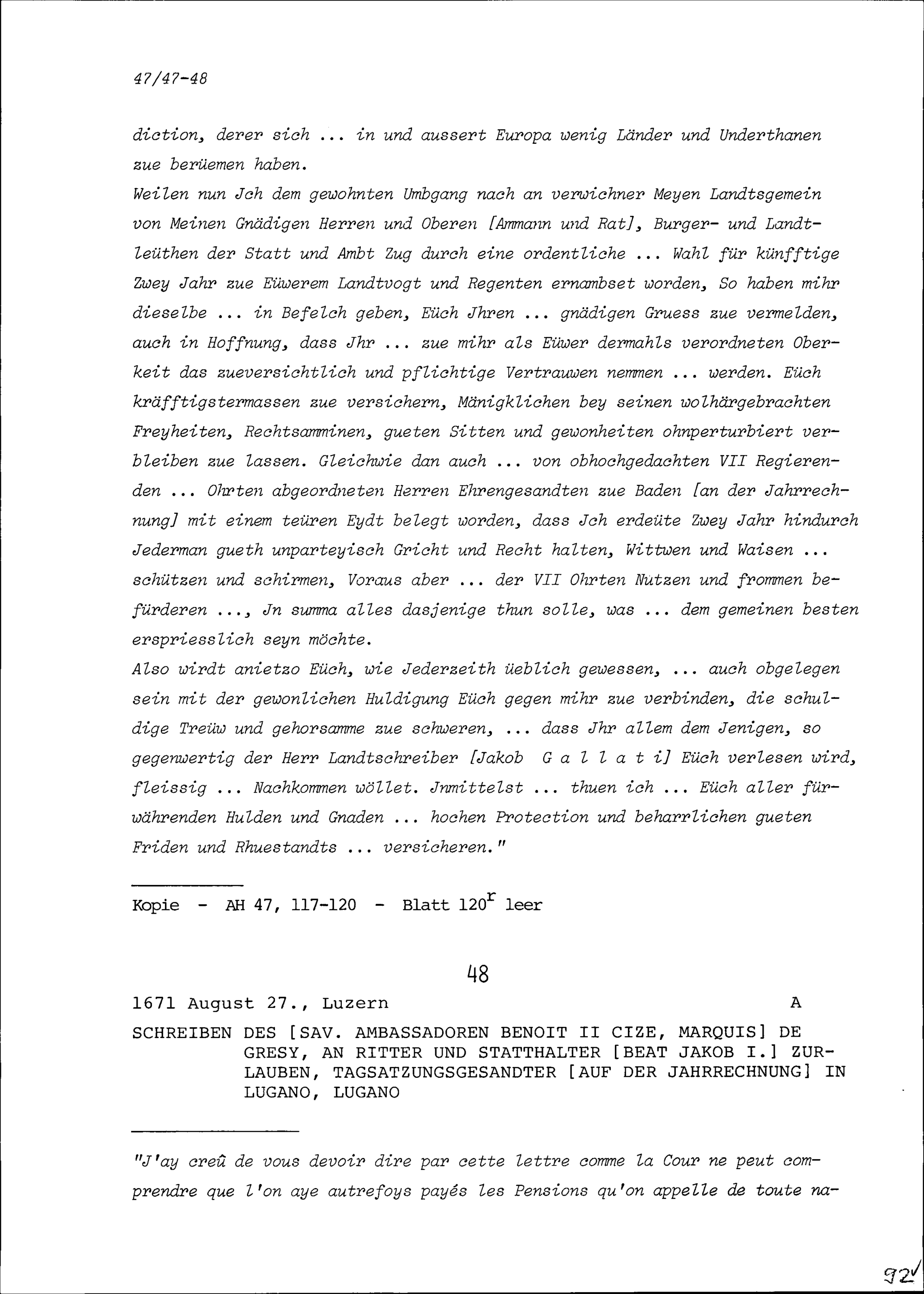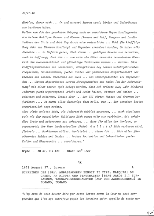 Schreiben von Benoît II. Cize, Marquis de Grésy, Ambassador von Savoyen, an Beat Jakob I. Zurlauben, Statthalter, Tagsatzungsgesandter auf der Jahrrechnung in Lugano, Lugano