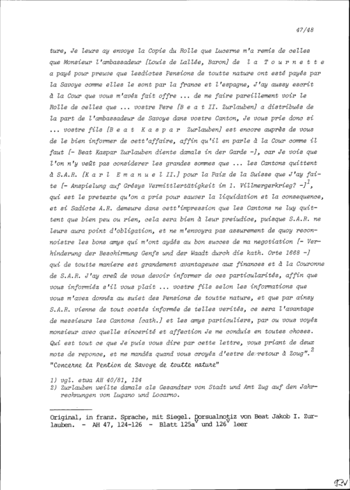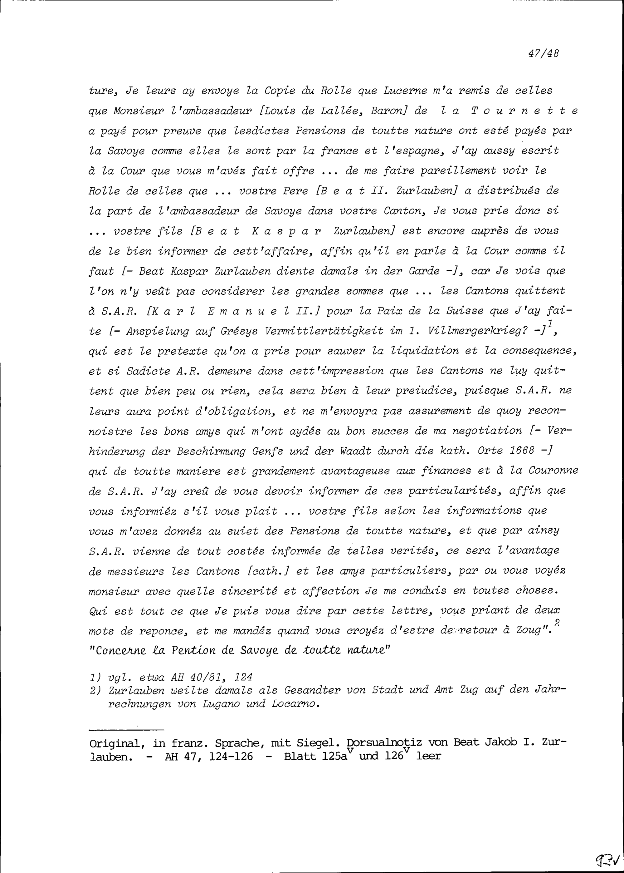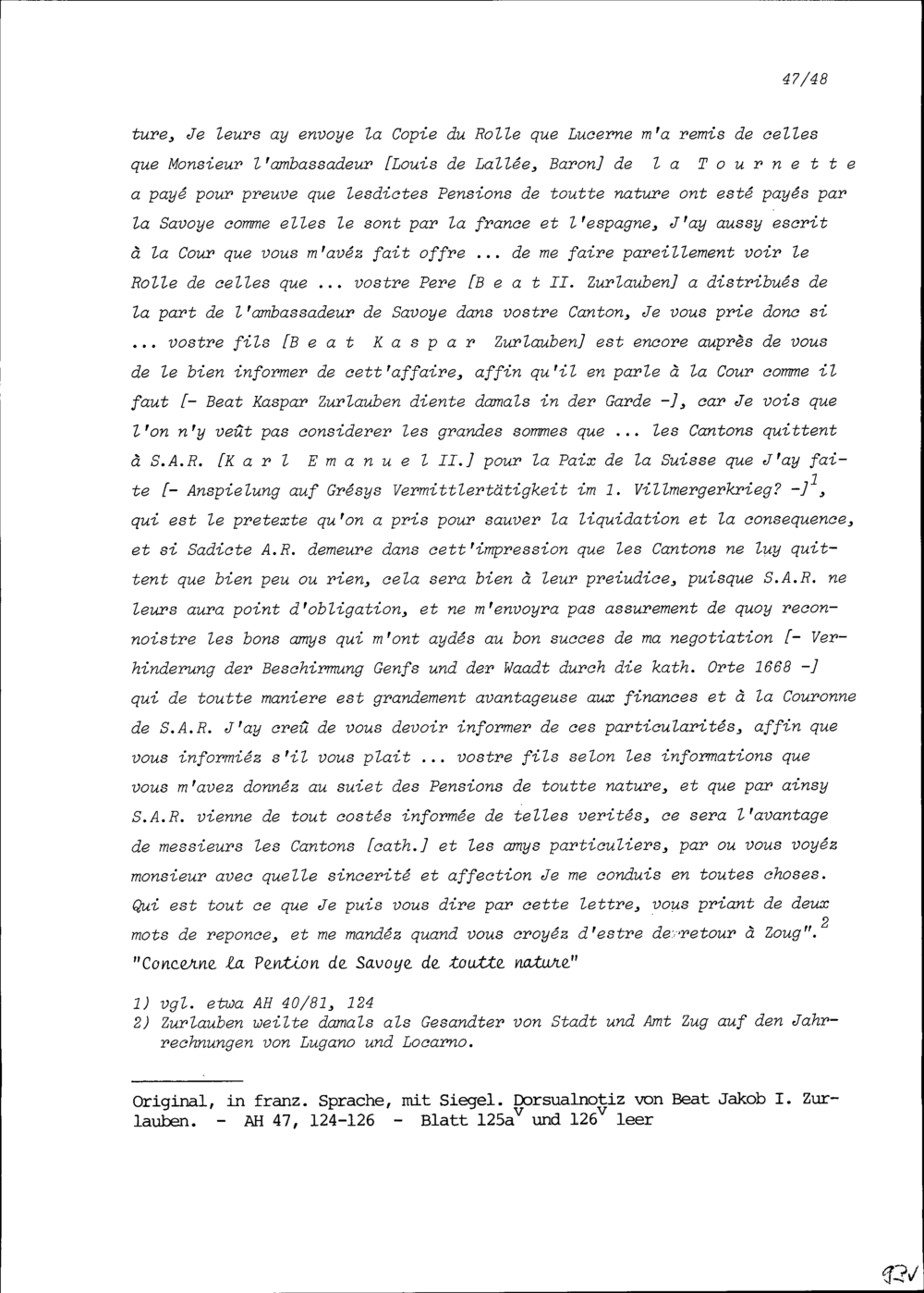 Schreiben von Benoît II. Cize, Marquis de Grésy, Ambassador von Savoyen, an Beat Jakob I. Zurlauben, Statthalter, Tagsatzungsgesandter auf der Jahrrechnung in Lugano, Lugano