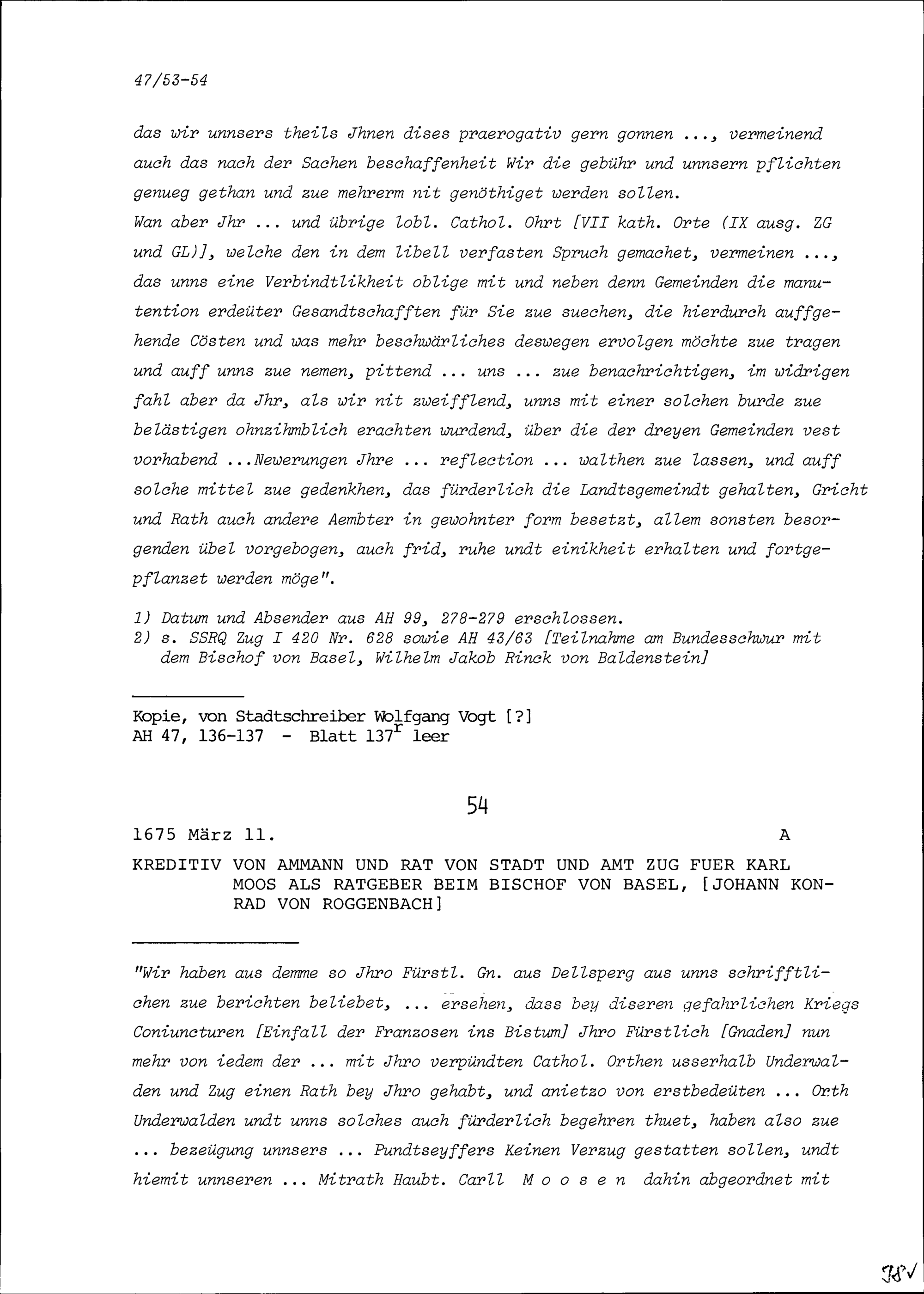 Kreditiv des Ammanns und Rats von Stadt und Amt Zug für Karl Moos als Ratgeber beim Bischof von Basel, Johann Konrad von Roggenbach