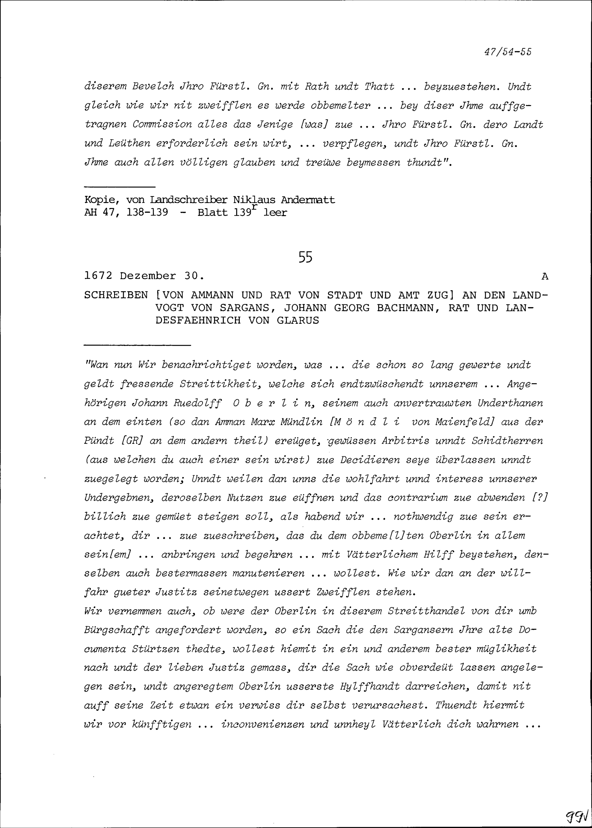 Schreiben des Ammanns und Rats von Stadt und Amt Zug an Johann Georg Bachmann, Landvogt von Sargans, Rat und Landesfähnrich von Glarus