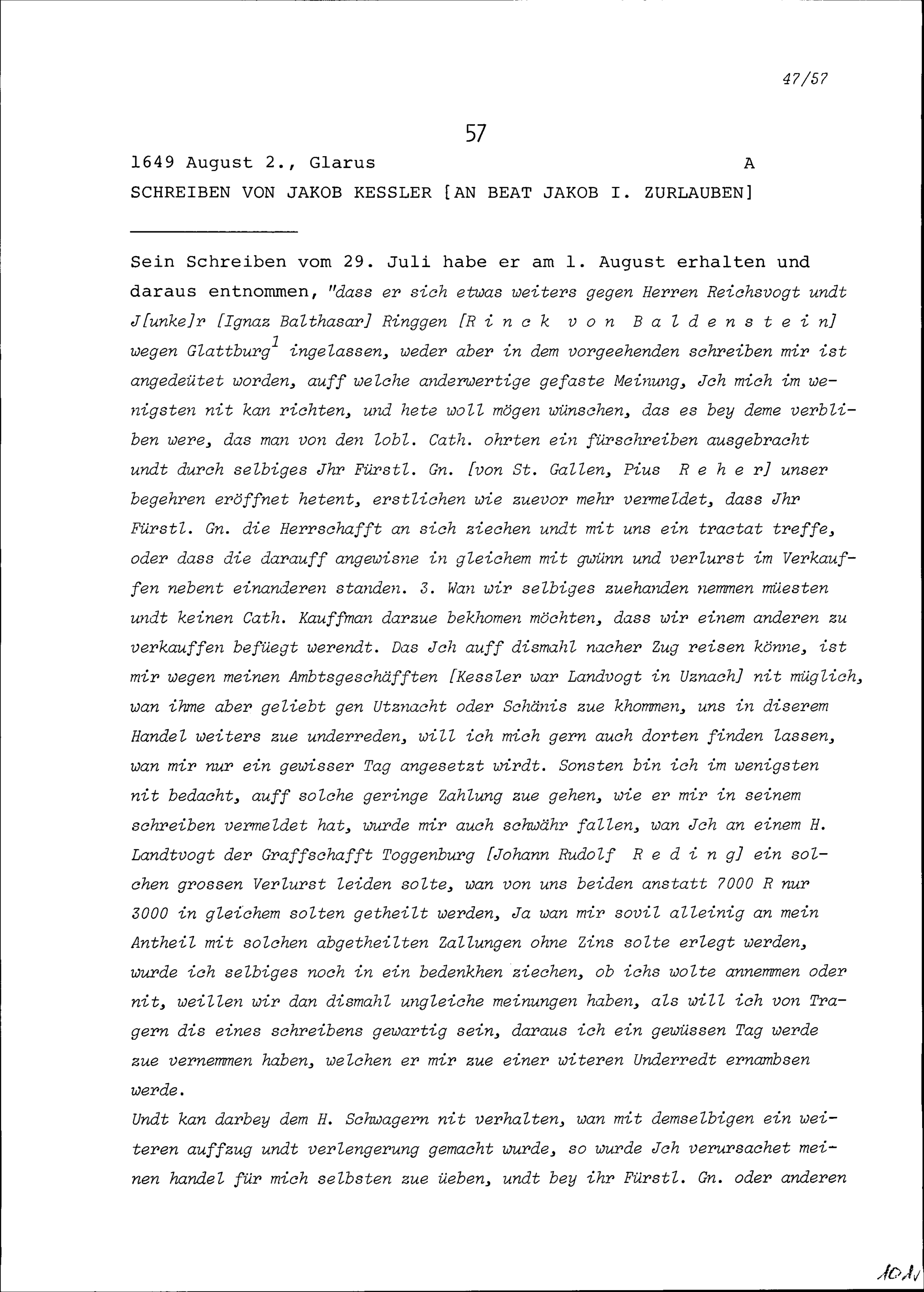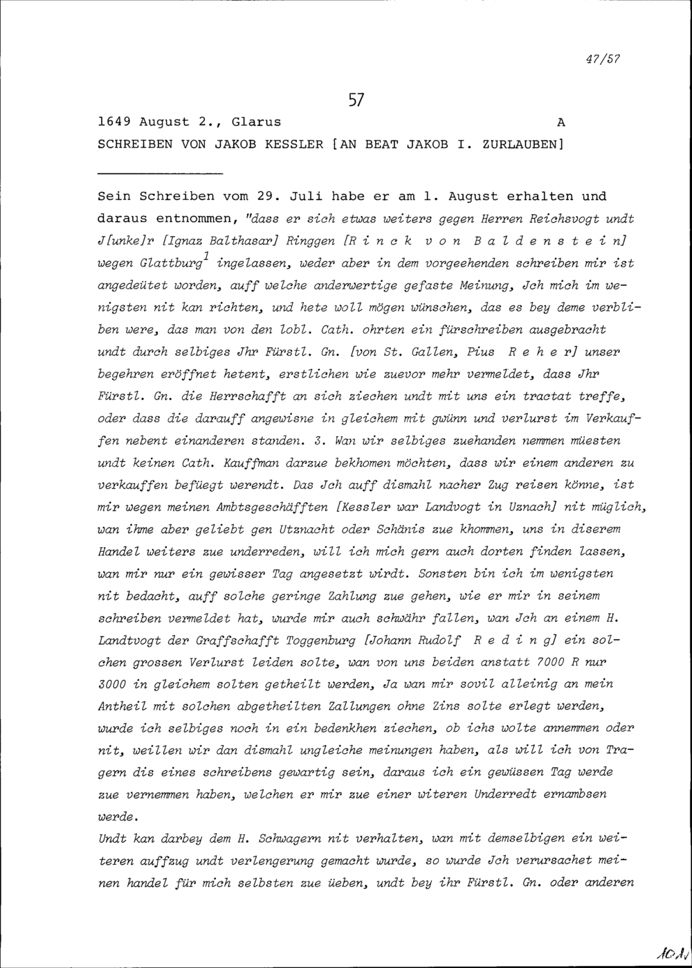 Schreiben von Jakob Kessler an Beat Jakob I. Zurlauben