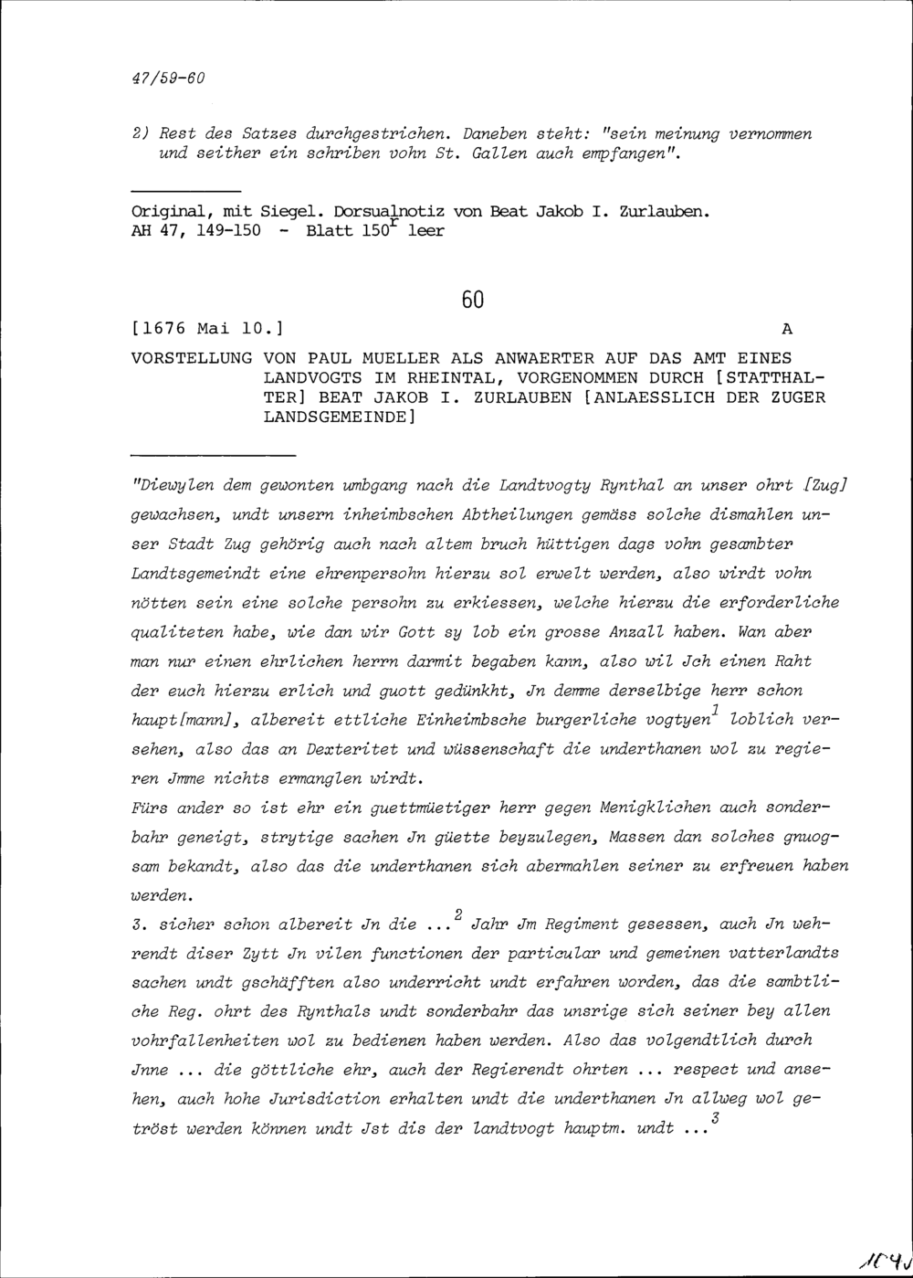 Vorstellung von Paul Müller als Anwärter auf das Amt eines Landvogts im Rheintal, vorgenommen durch Beat Jakob I. Zurlauben, Statthalter, anlässlich der Zuger Landsgemeinde