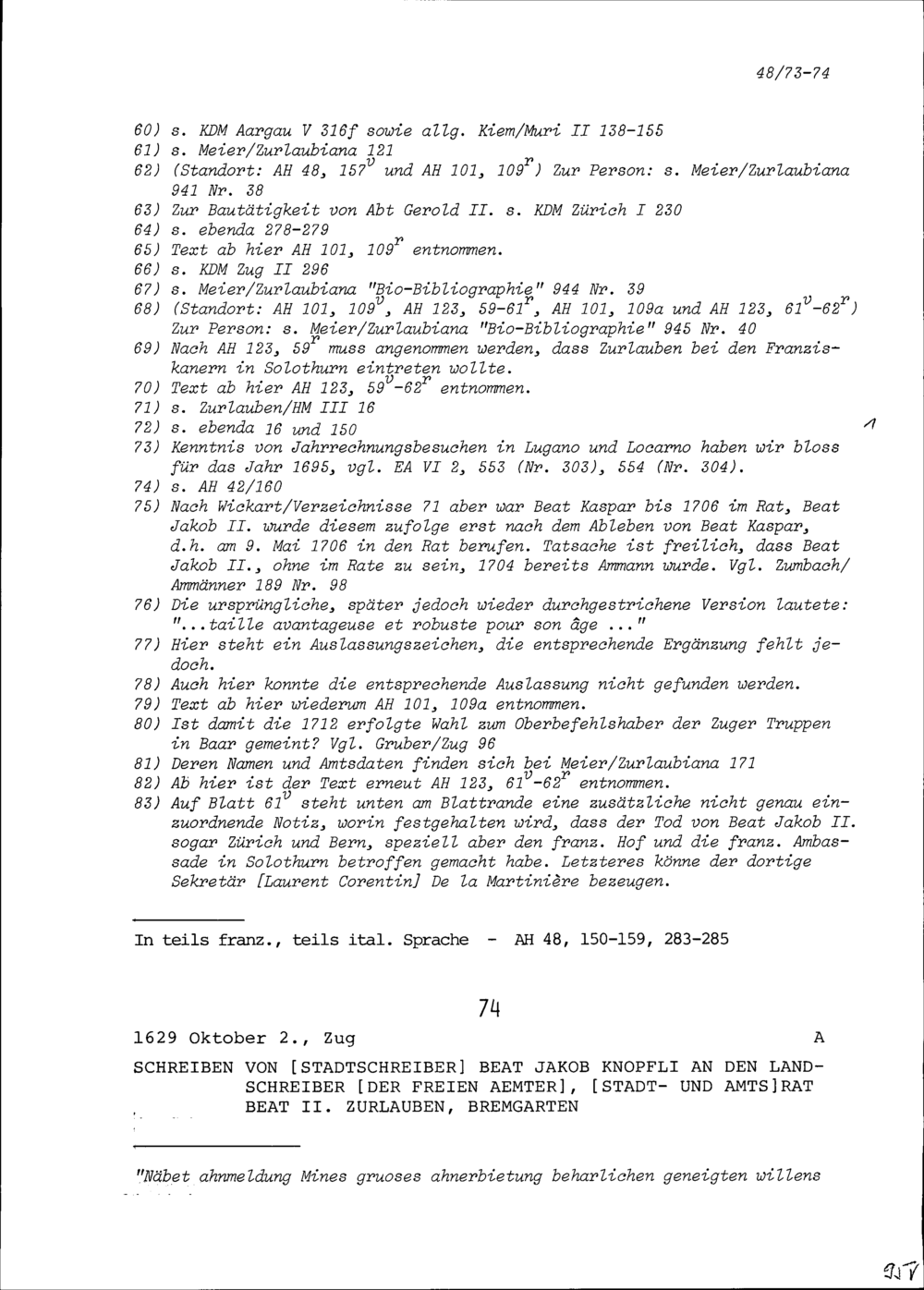 Schreiben von Beat Jakob Knopfli, Stadtschreiber, an Beat II. Zurlauben, Landschreiber...