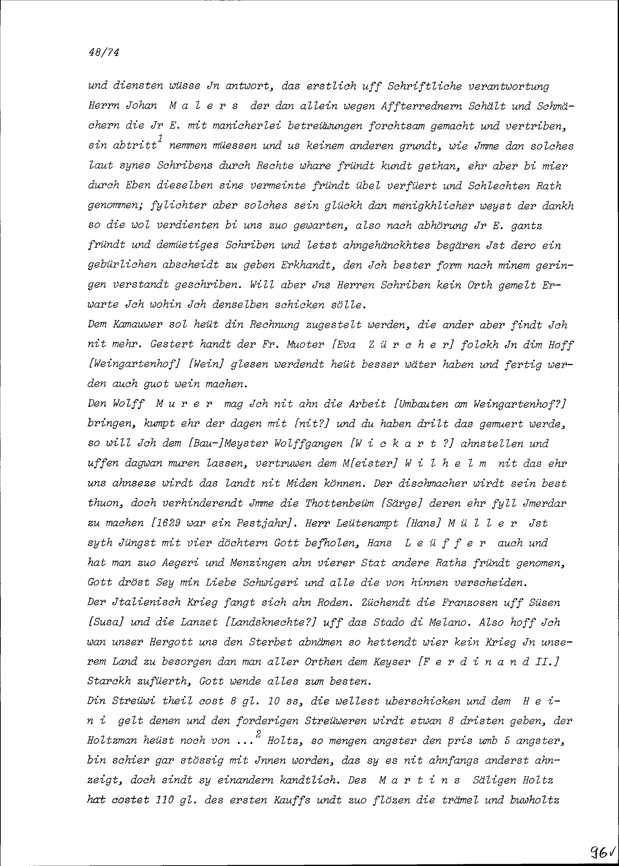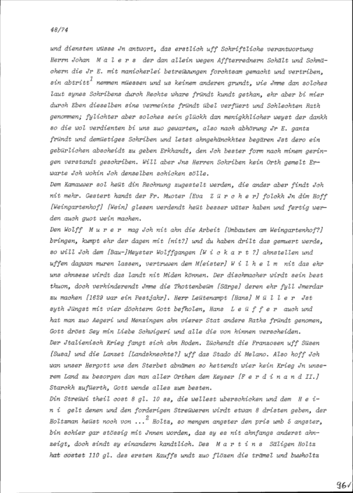 Schreiben von Beat Jakob Knopfli, Stadtschreiber, an Beat II. Zurlauben, Landschreiber...