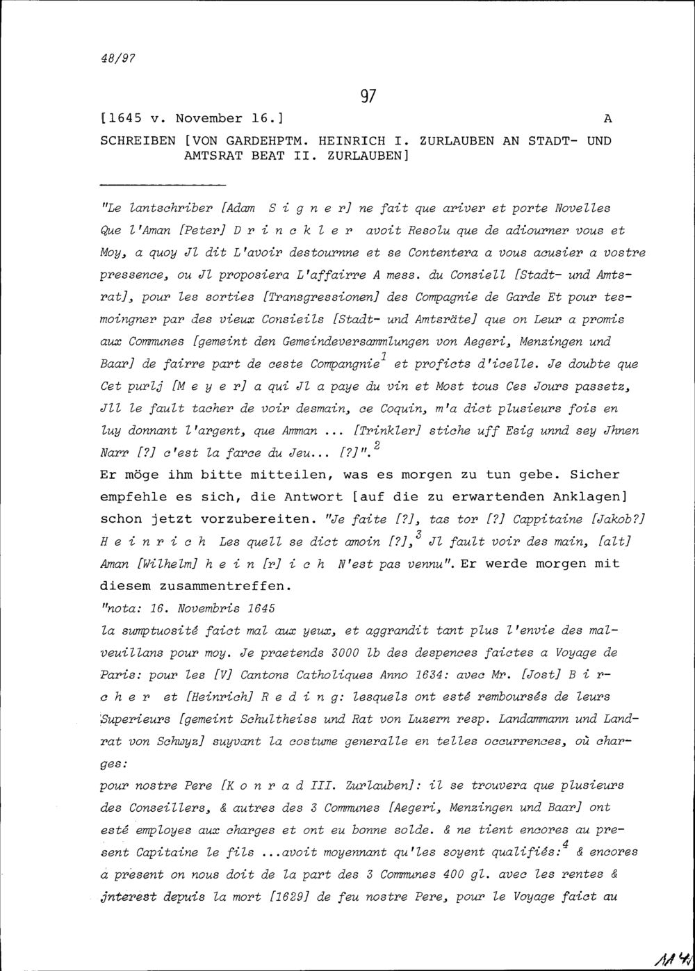 Schreiben von Heinrich I. Zurlauben, Gardehauptmann, an Beat II. Zurlauben, Stadt- und Amtrat