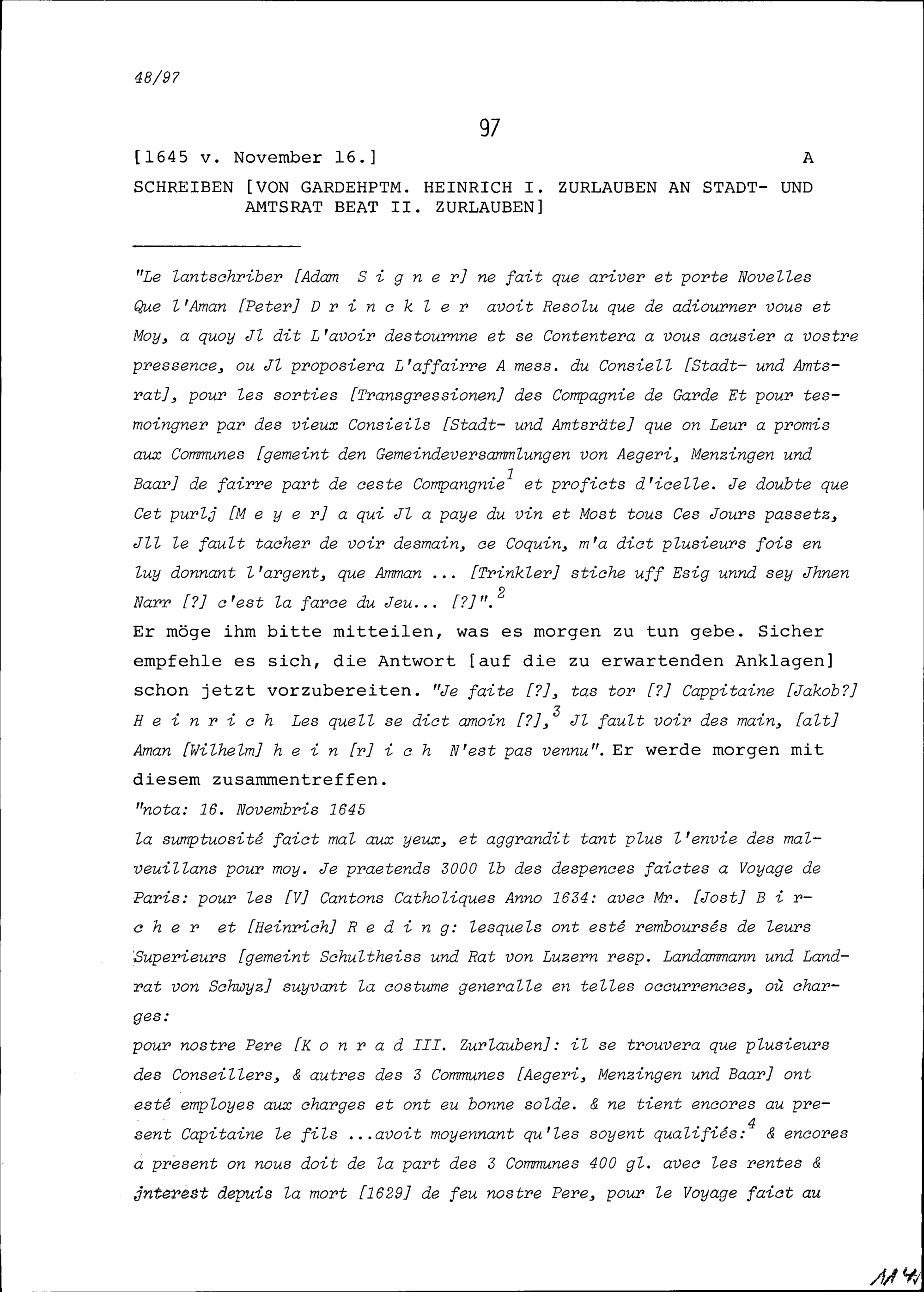Schreiben von Heinrich I. Zurlauben, Gardehauptmann, an Beat II. Zurlauben, Stadt-...