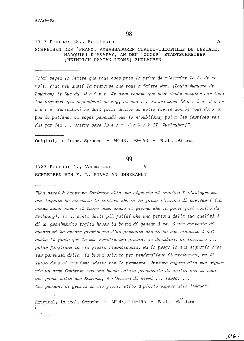 Schreiben von Claude-Théophile de Béziade, Marquis d'Avaray, Ambassador von Frankreich, an Heinrich Damian Leonz Zurlauben, Zuger Stadtschreiber