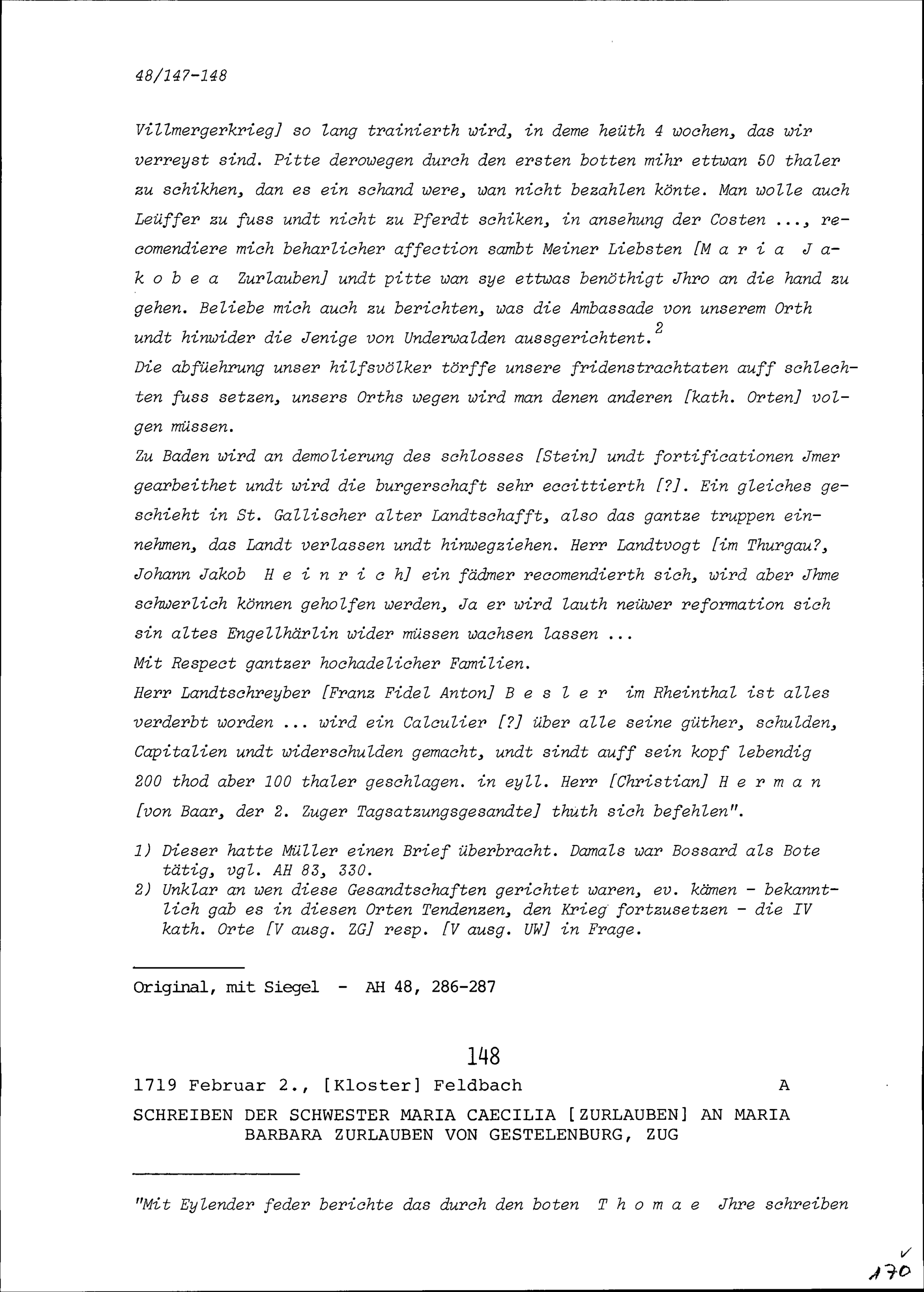 Schreiben von Maria Cäcilia Zurlauben, Klosterfrau, an Maria Barbara Zurlauben, Zug