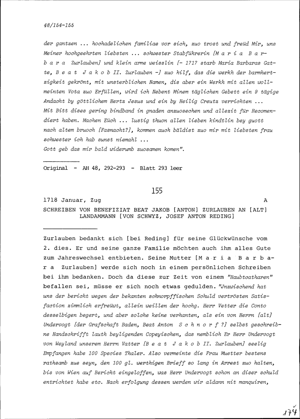 Schreiben von Beat Jakob Anton Zurlauben, Priester und Benefiziat, an Josef Anton Reding, Altlandammann von Schwyz