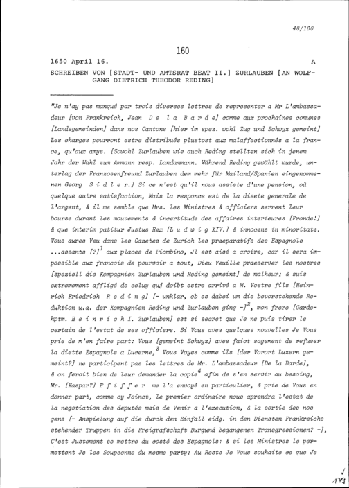 Schreiben von Beat II. Zurlauben, Stadt- und Amtrat, an Wolfgang Dietrich Theodor Reding