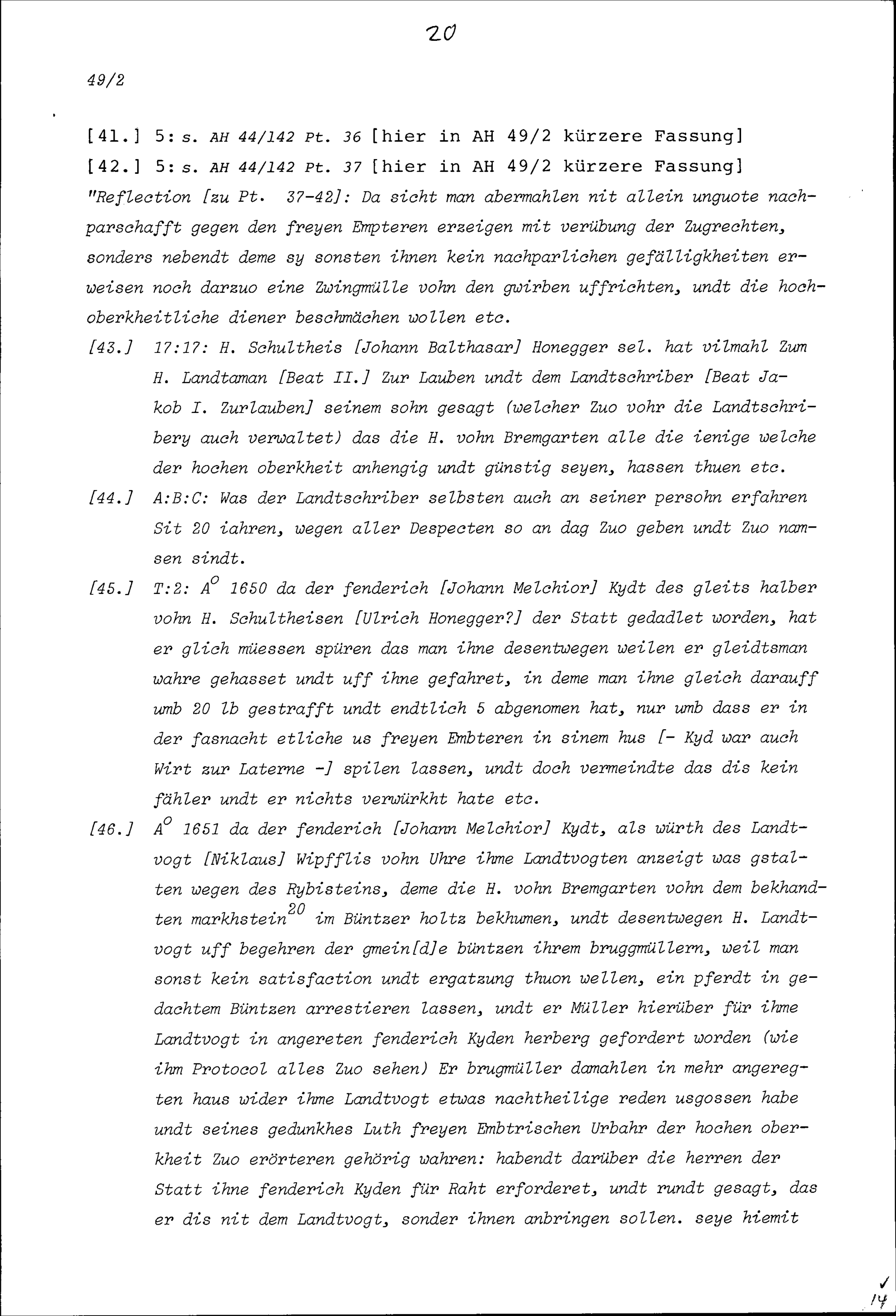 Berichte und Aufzeichnungen von Rechtssatzungen (insgesamt 57 Artikel), die Obrigkeit der Sieben in den Freien Ämter regierenden Orte, den Landschreiber und die Untertanen betreffen, sowie das Verhältnis der Oberamtleute in den Freien Ämter zu der Stadt Bremgarten, die Strafbefugnis des Landvogts in Bremgarten, Ehrenvorrang des Landschreibers in Bremgarten, Exemption des Landschreibers vom Bremgartener Stadtgericht
