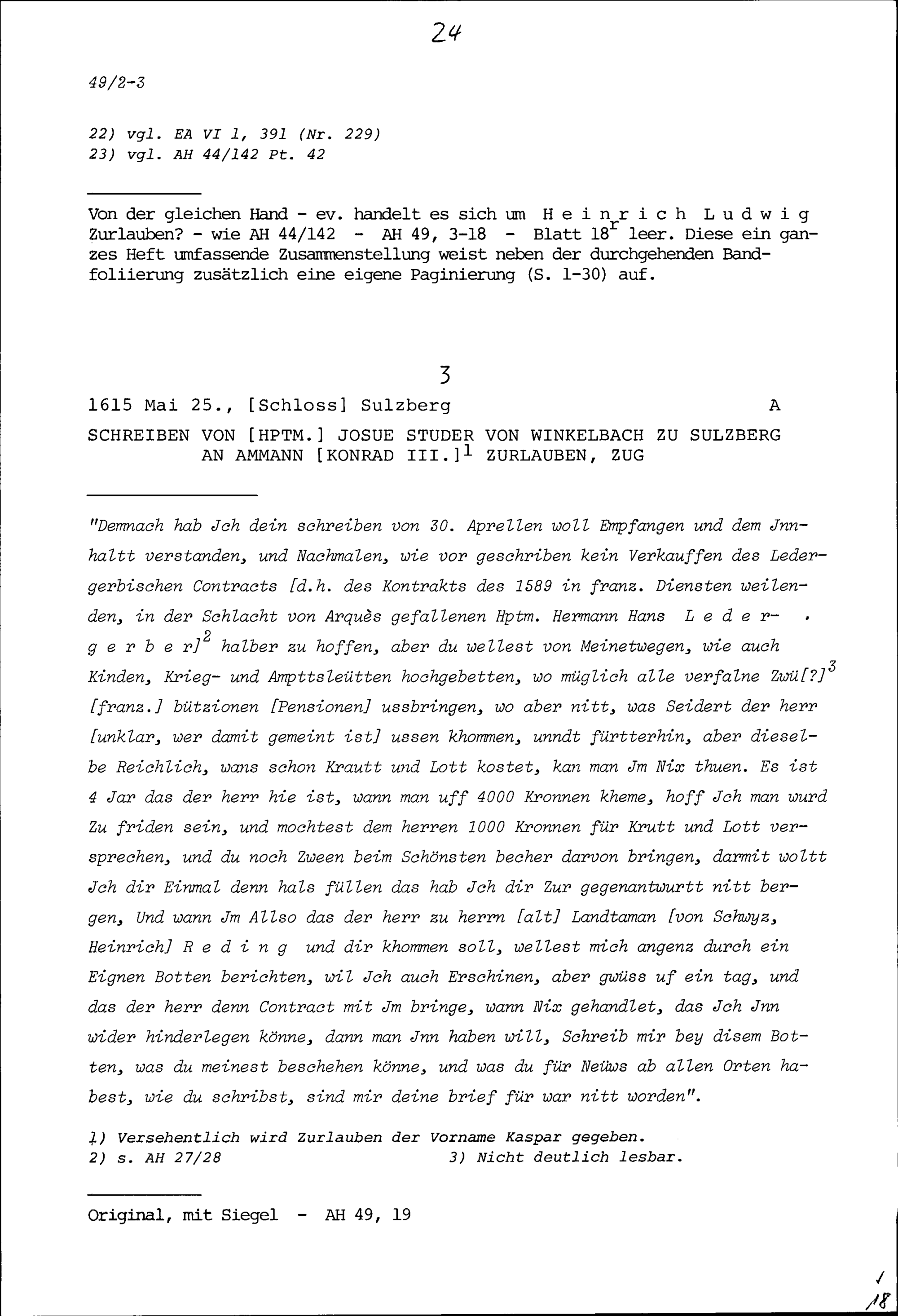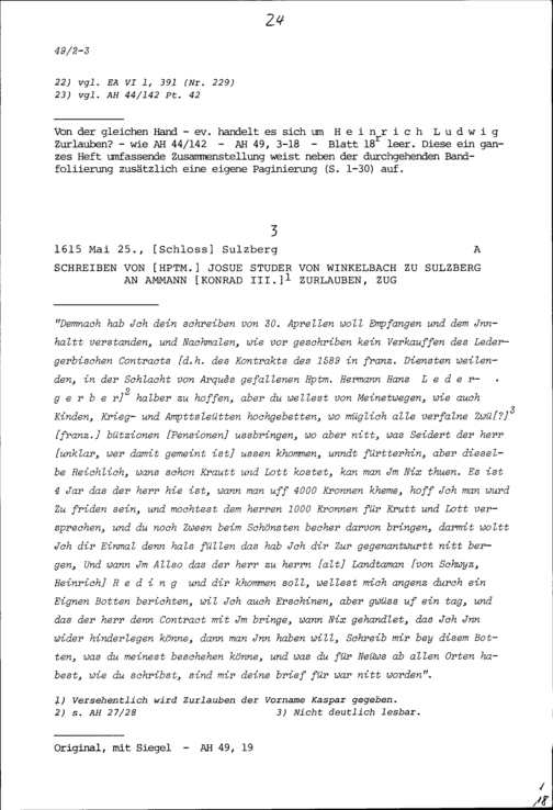 Schreiben von Josue Studer, Hauptmann, von Winkelbach zu Sulzberg, an Konrad III. Zurlauben, Ammann, Zug