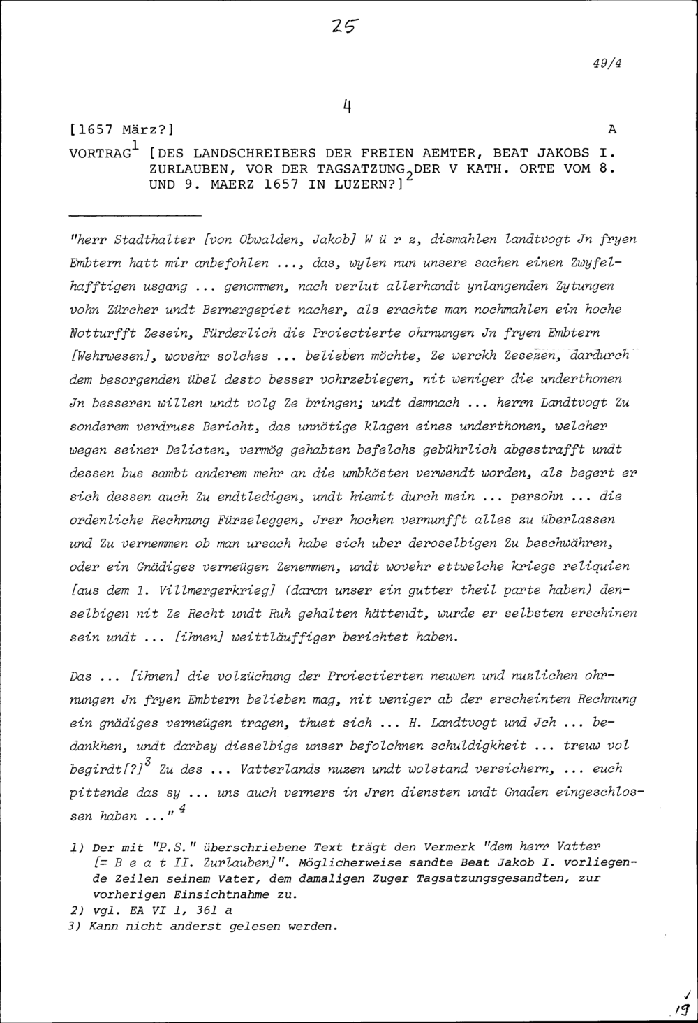 Vortrag von Beat Jakob I. Zurlauben, Landschreiber der Freien Ämter, vor der Tagsatzung der Fünf Katholischen Orte in Luzern vom 8. und 9. März 1657