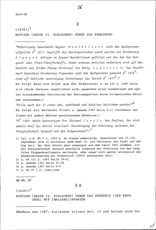 Notiz von Beat II. Zurlauben über die Erbeinung