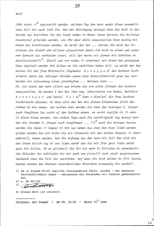 Schreiben von Kaspar Dorer an Beat II. Zurlauben, Altammann, Zug