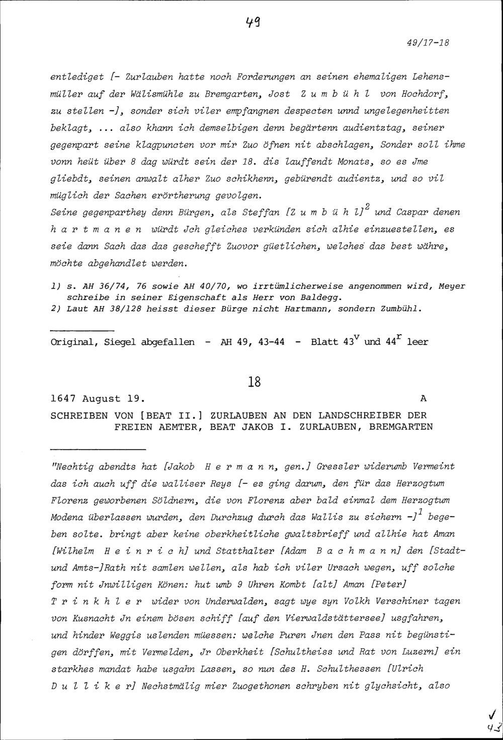 Schreiben von Beat II. Zurlauben an Beat Jakob I. Zurlauben, Landschreiber der Freien Ämter, Bremgarten