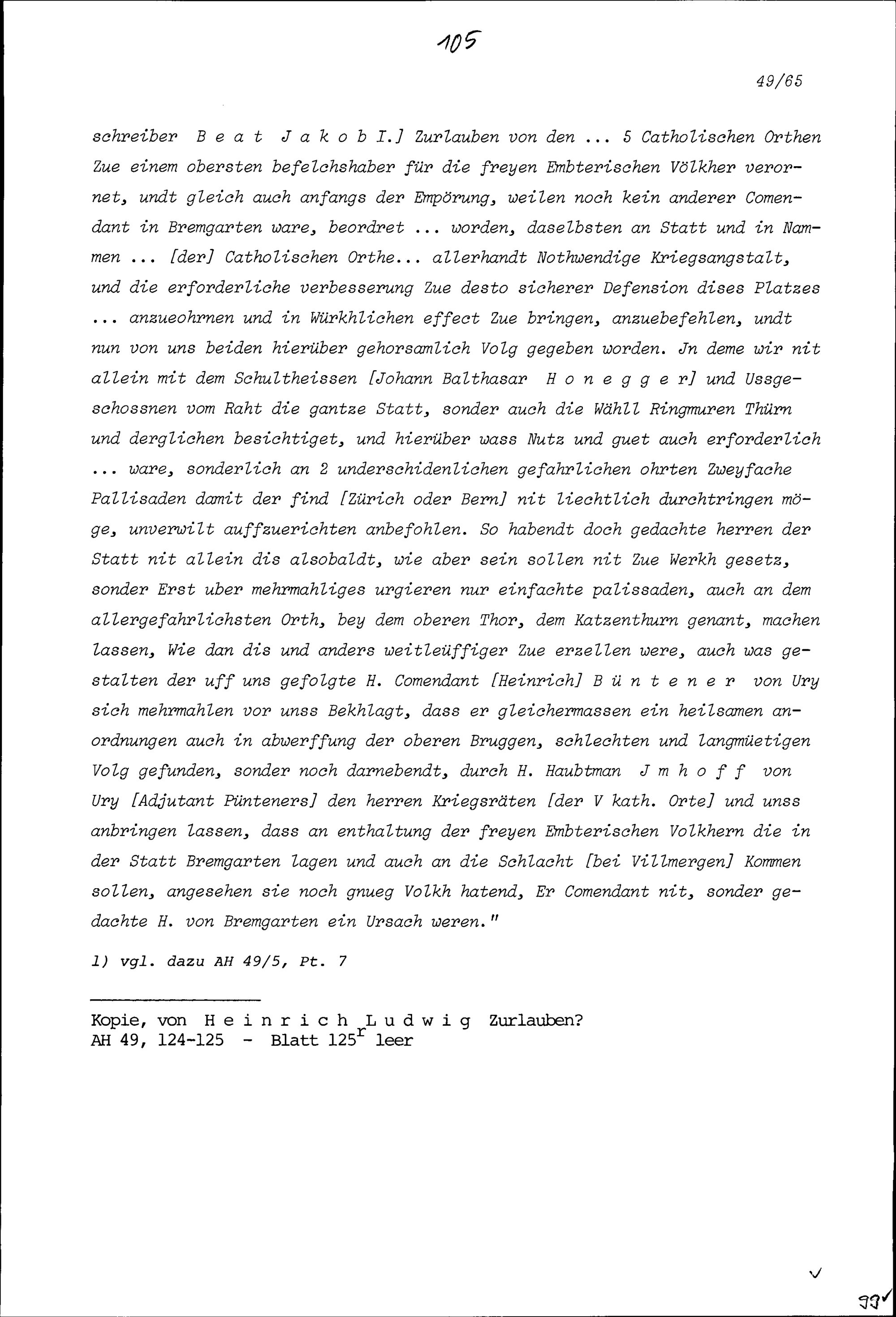 Bericht des 1656 regierenden Landvogts der Freien Ämter, Jakob Wirz, über das Verhalten der Stadt Bremgarten im Ersten Villmergerkrieg