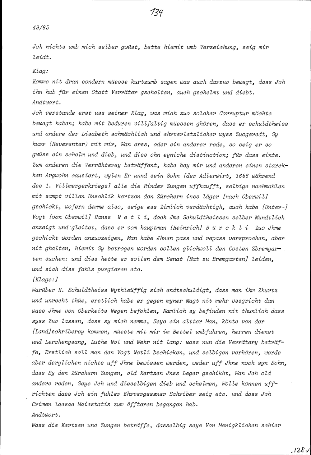 Klage und Antwort zwischen Simon Marx, Landschreibersubstitut der Freien Ämter, und Hans Rudolf Imhof, Altschultheiss und Rat von Bremgarten, vor den Räten zu Bremgarten sowie deren Urteil, aufgezeichnet von Simon Marx