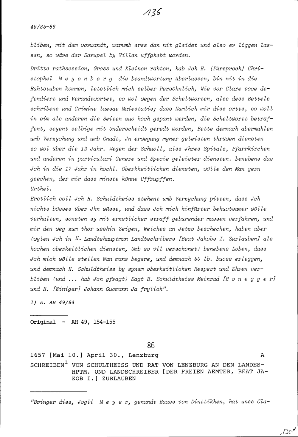 Schreiben des Schultheiss und Rats von Lenzburg an Beat Jakob I. Zurlauben, Landeshauptmann und Landschreiber der Freien Ämter