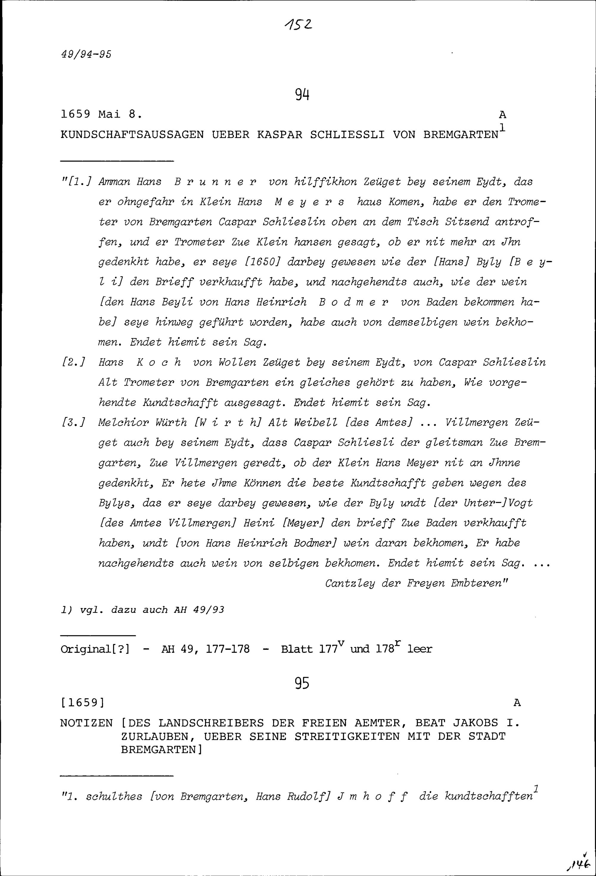 Kundschaftsaussagen über Kaspar Schliessli von Bremgarten