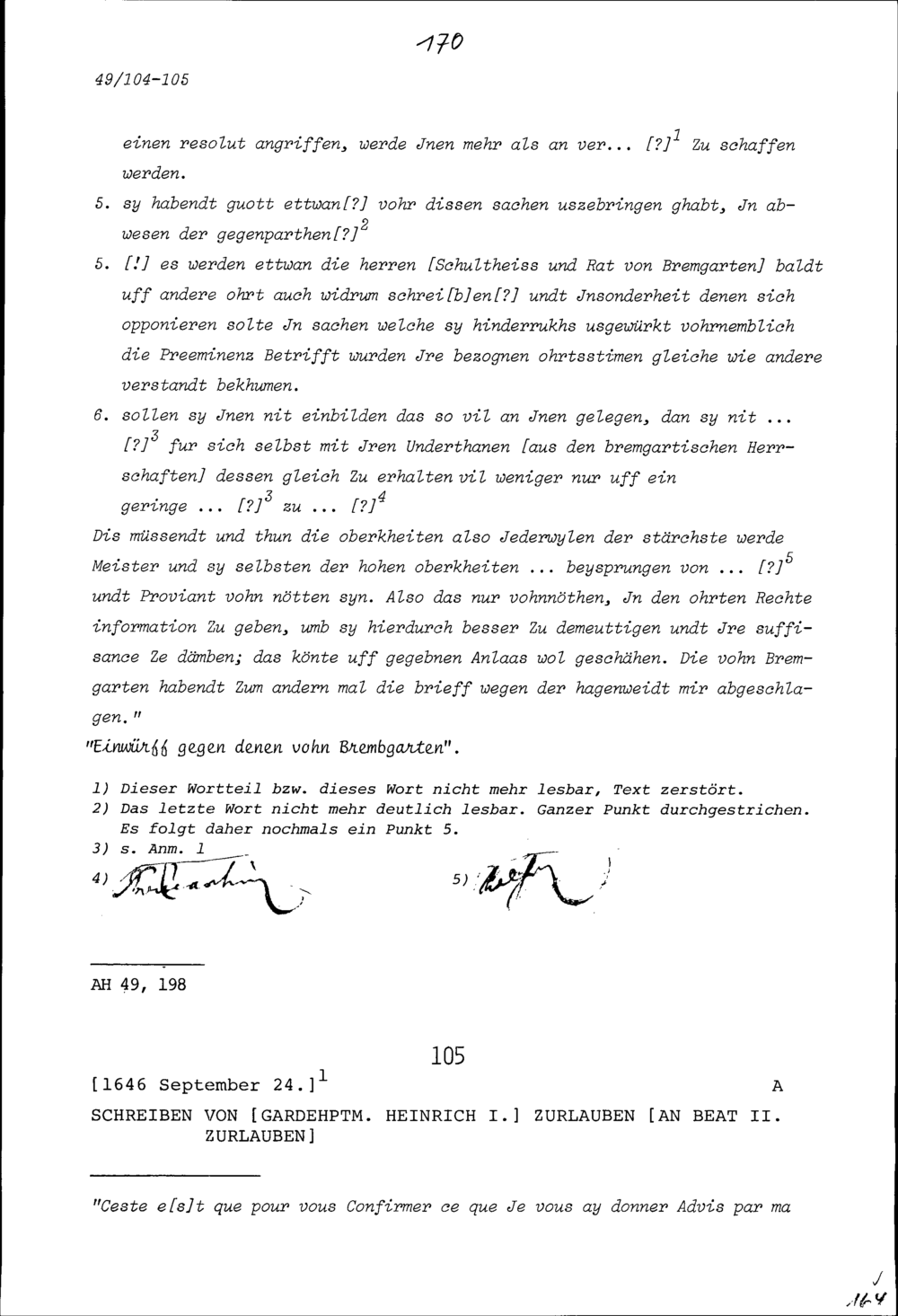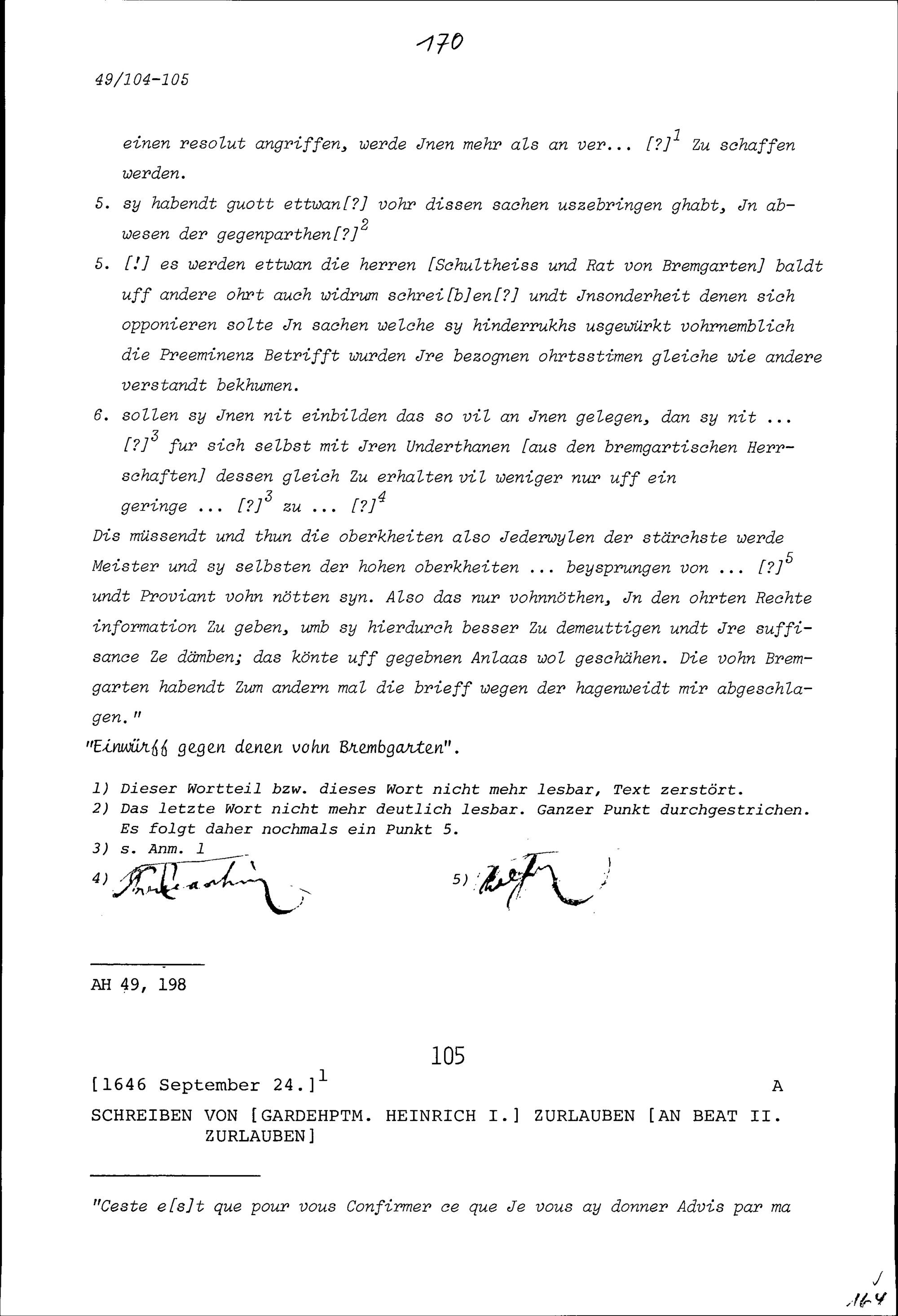 Schreiben von Heinrich I. Zurlauben, Gardehauptmann, an Beat II. Zurlauben