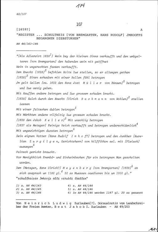 Aufzählung von Diebereien von Hans Rudolf Imhof, Schultheiss