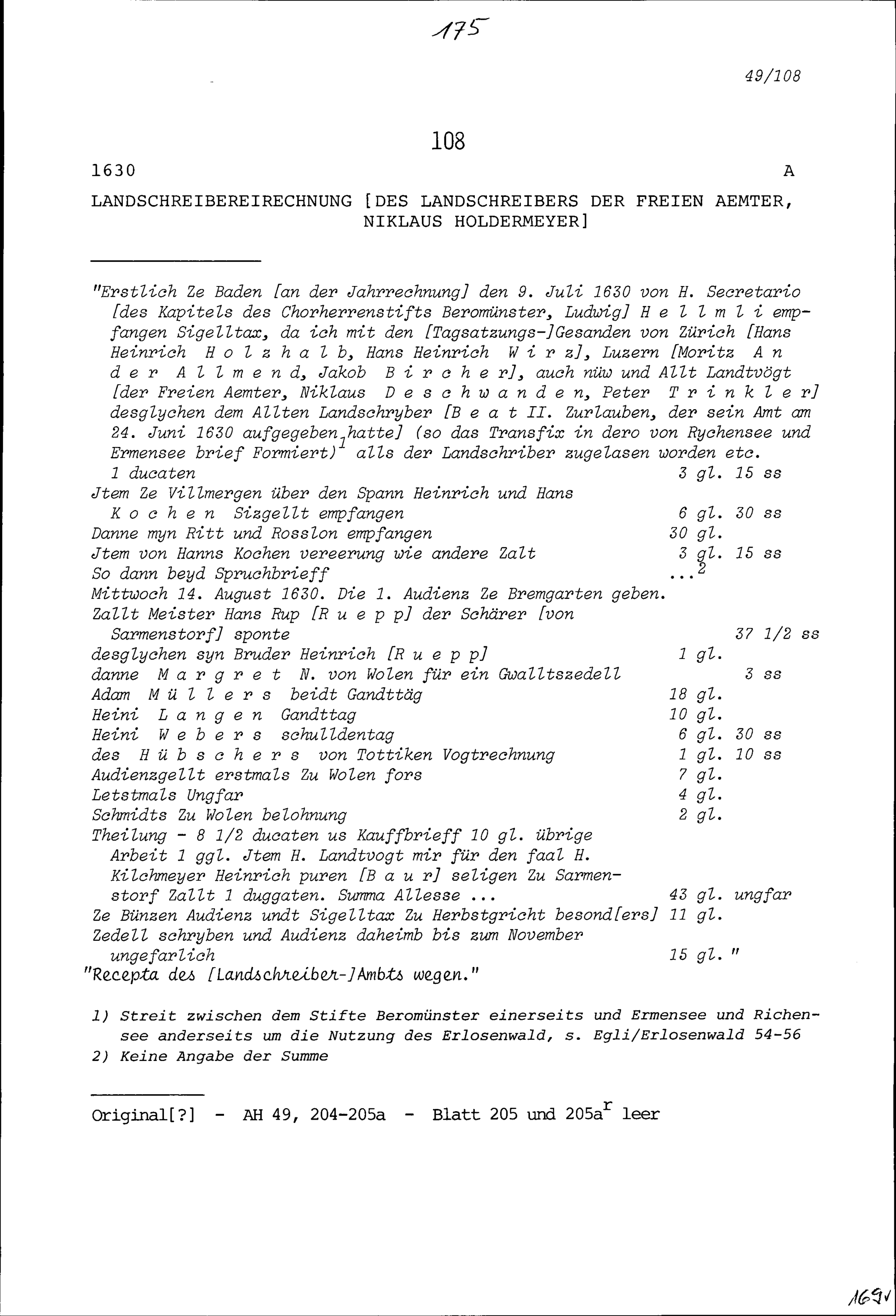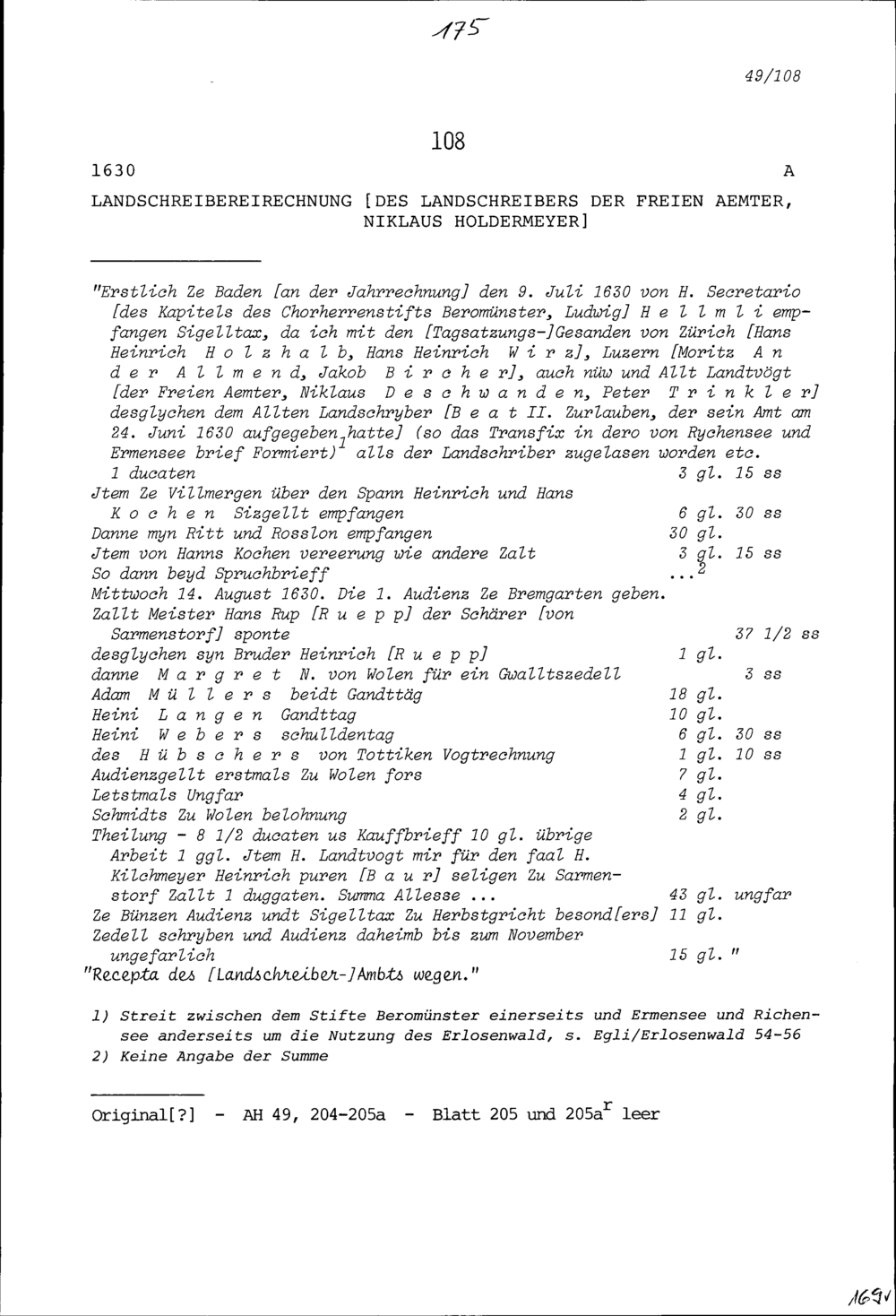 Landschreibereirechnung von Niklaus Holdermeyer, Landschreiber der Freien Ämter