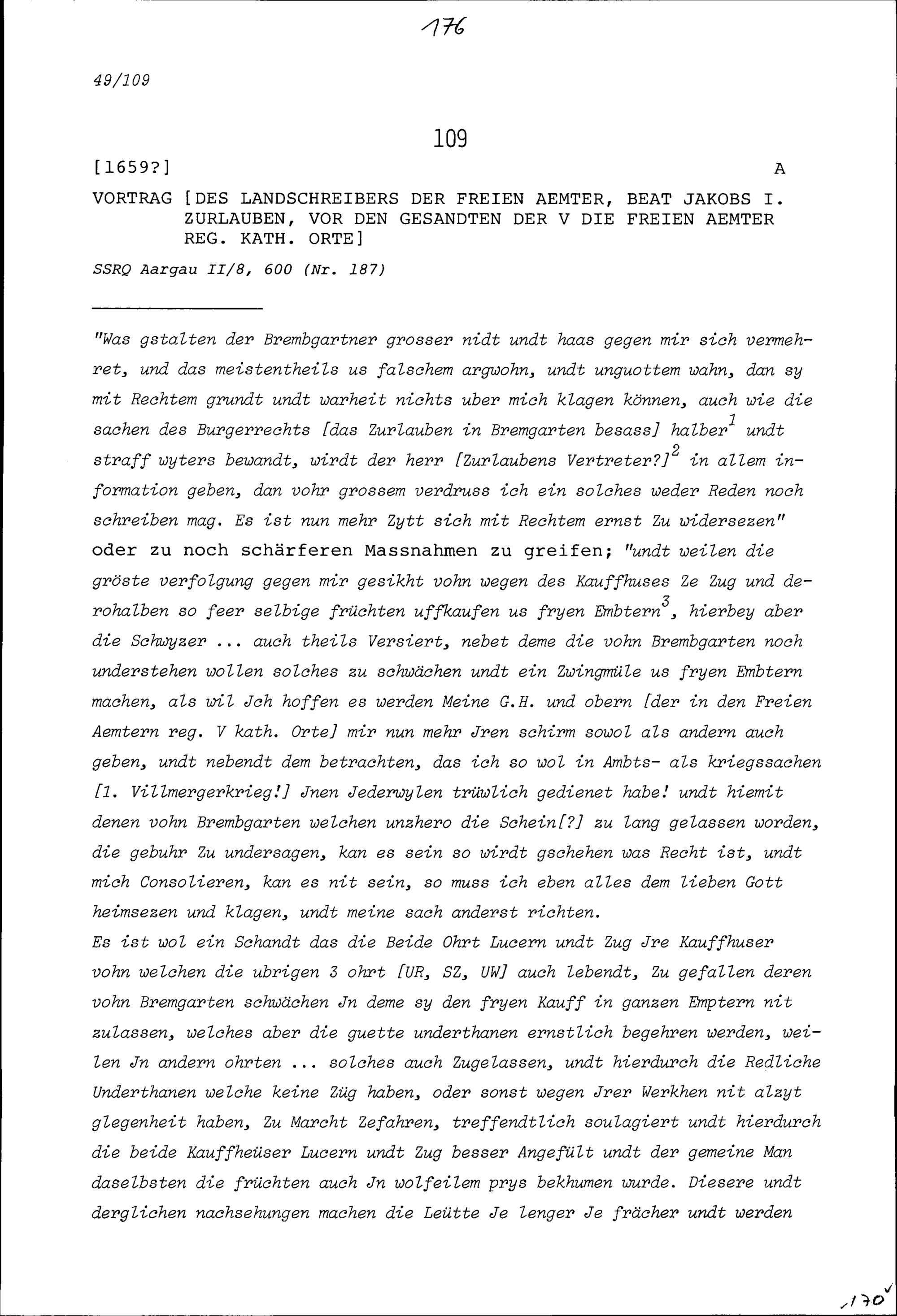 Vortrag von Beat Jakob I. Zurlauben, Landschreiber der Freien Ämter, vor den Gesandten der Fünf die Freien Ämter regierenden Katholischen Orte