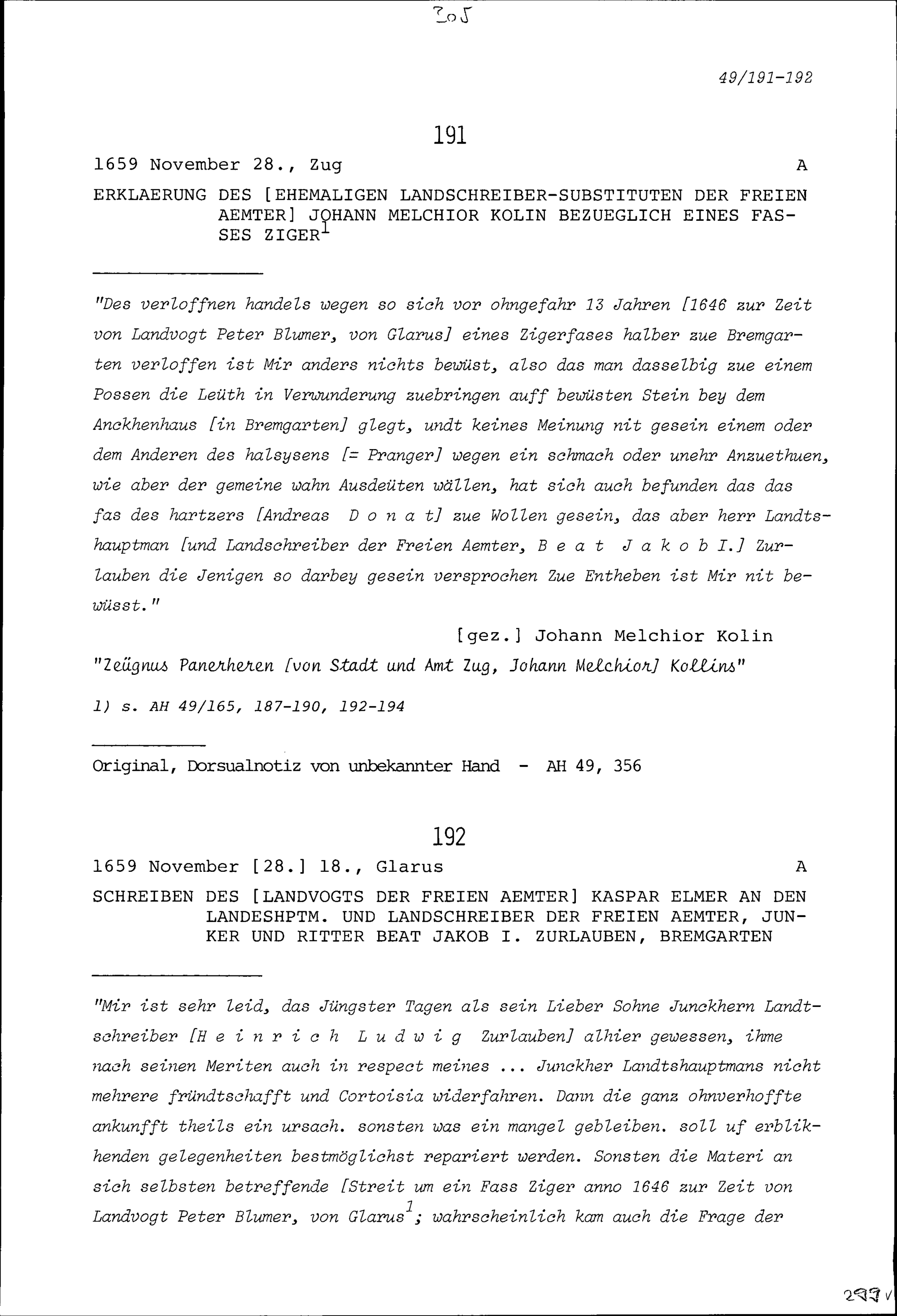 Erklärung von Johann Melchior Kolin, Altlandschreiber-Substitut der Freien Ämter, bezüglich eines Fasse Ziger