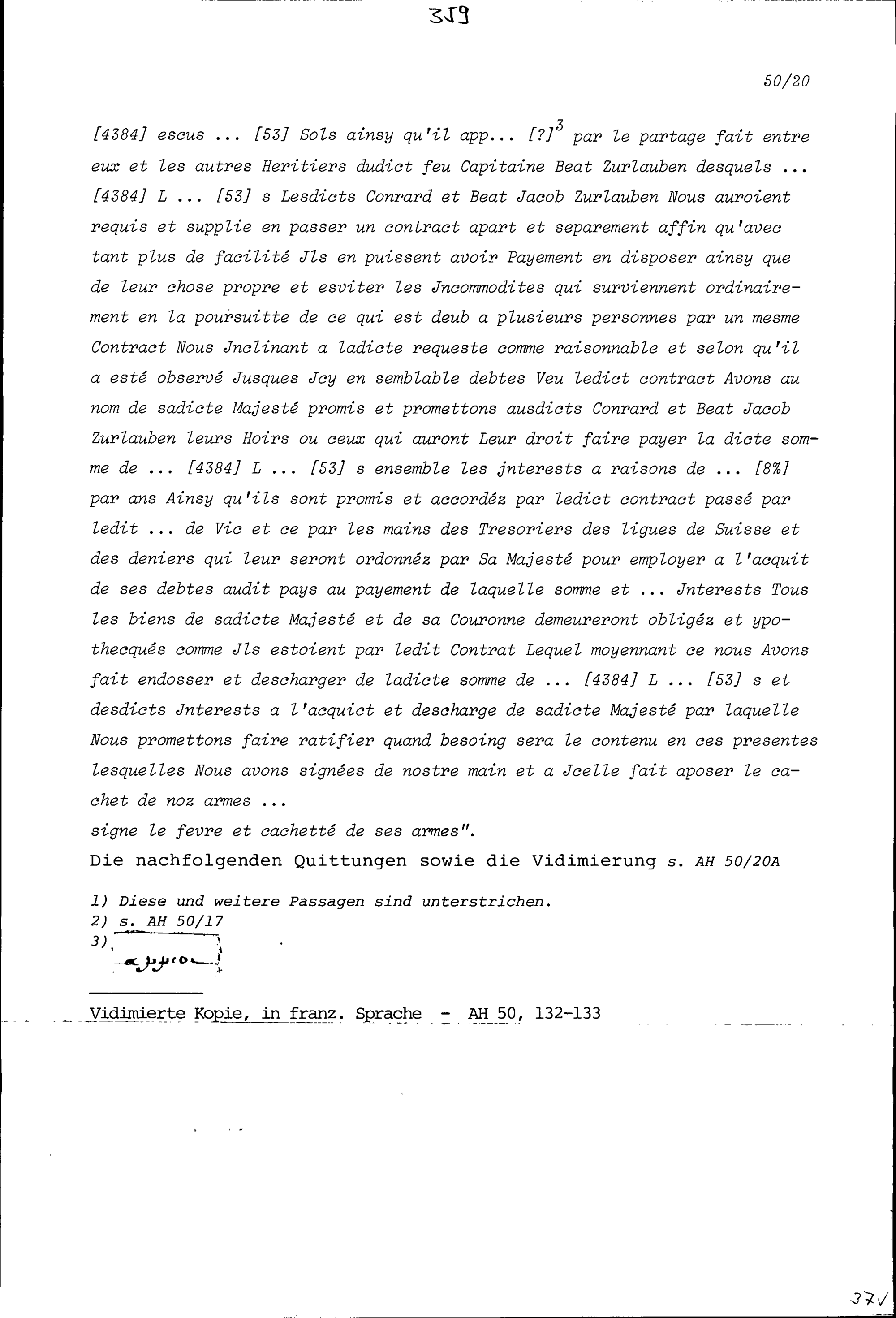 Schuldschein zugunsten von Konrad III. und Beat Jakob Zurlauben, ausgestellt von Louis Le Fèvre de Caumartin Ambassador von Frankreich