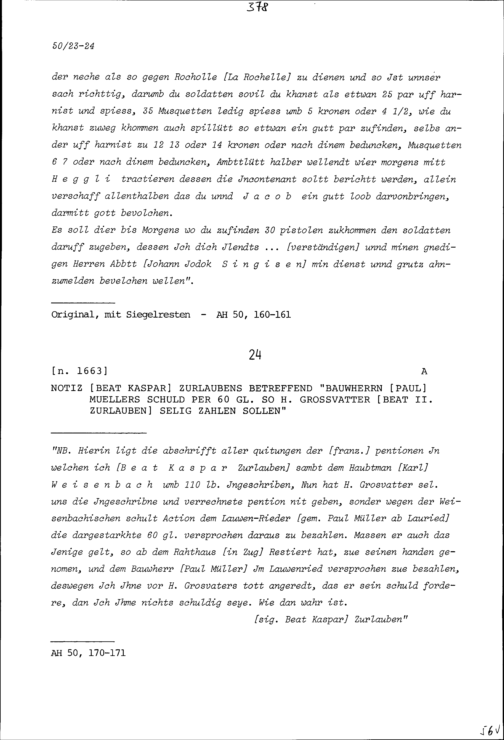 Notiz von Beat Kaspar Zurlauben betreffend die Schuld von Paul Müller, Bauherr, über 60 Gulden, die er seinem Grossvater Beat II. Zurlauben, selig, bezahlen sollte