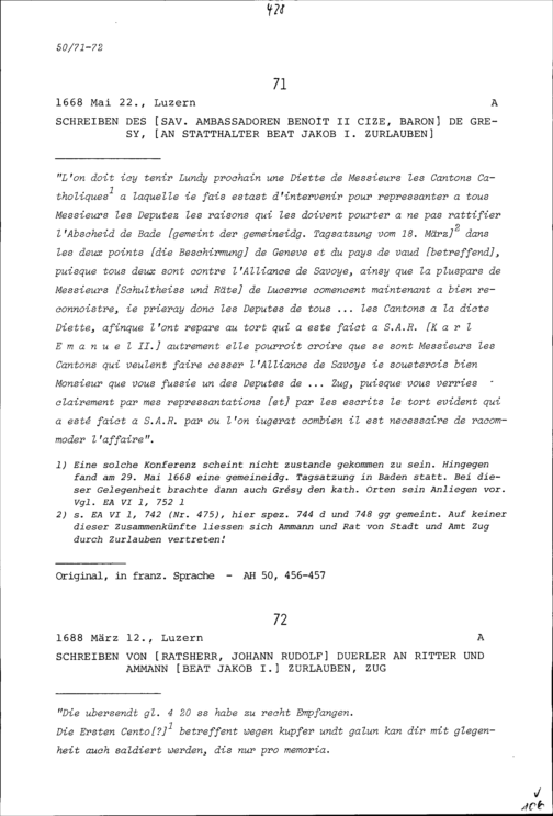 Schreiben von Benoît II. Cize, Baron de Grésy, Ambassador von Frankreich, an Beat Jakob I. Zurlauben, Statthalter