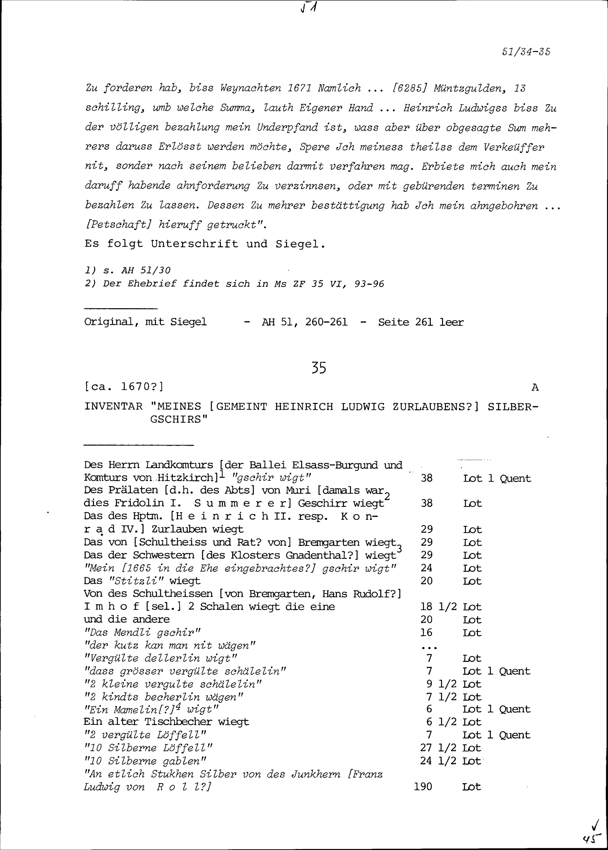 Inventar des Silbergeschirrs von Heinrich Ludwig Zurlauben