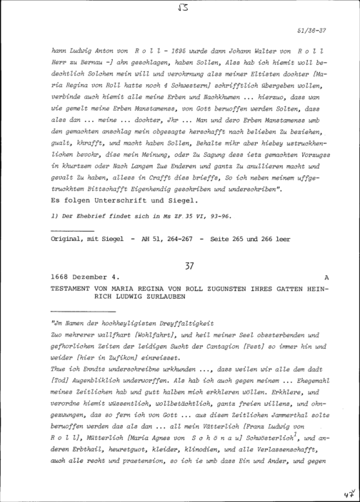 Testament von Maria Regina von Roll zugunsten Heinrich Ludwig Zurlauben, Gatte