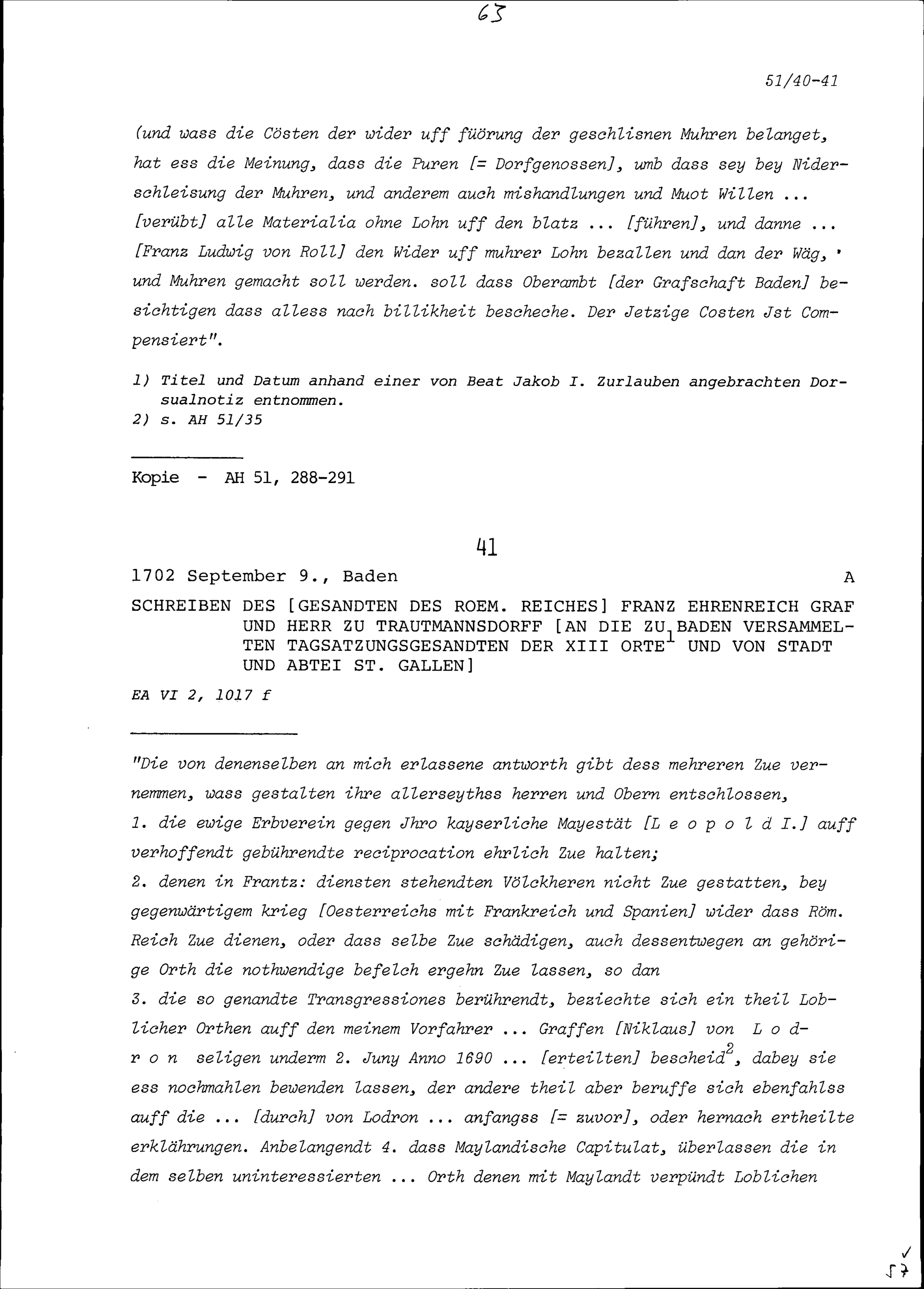 Schreiben von Franz Ehrenreich, Graf und Herr zu Trautmannsdorff, Gesandter des Römischen Reiches, an die Tagsatzungsgesandten der Dreizehn Orte und von Stadt und Abtei Sankt Gallen in Baden
