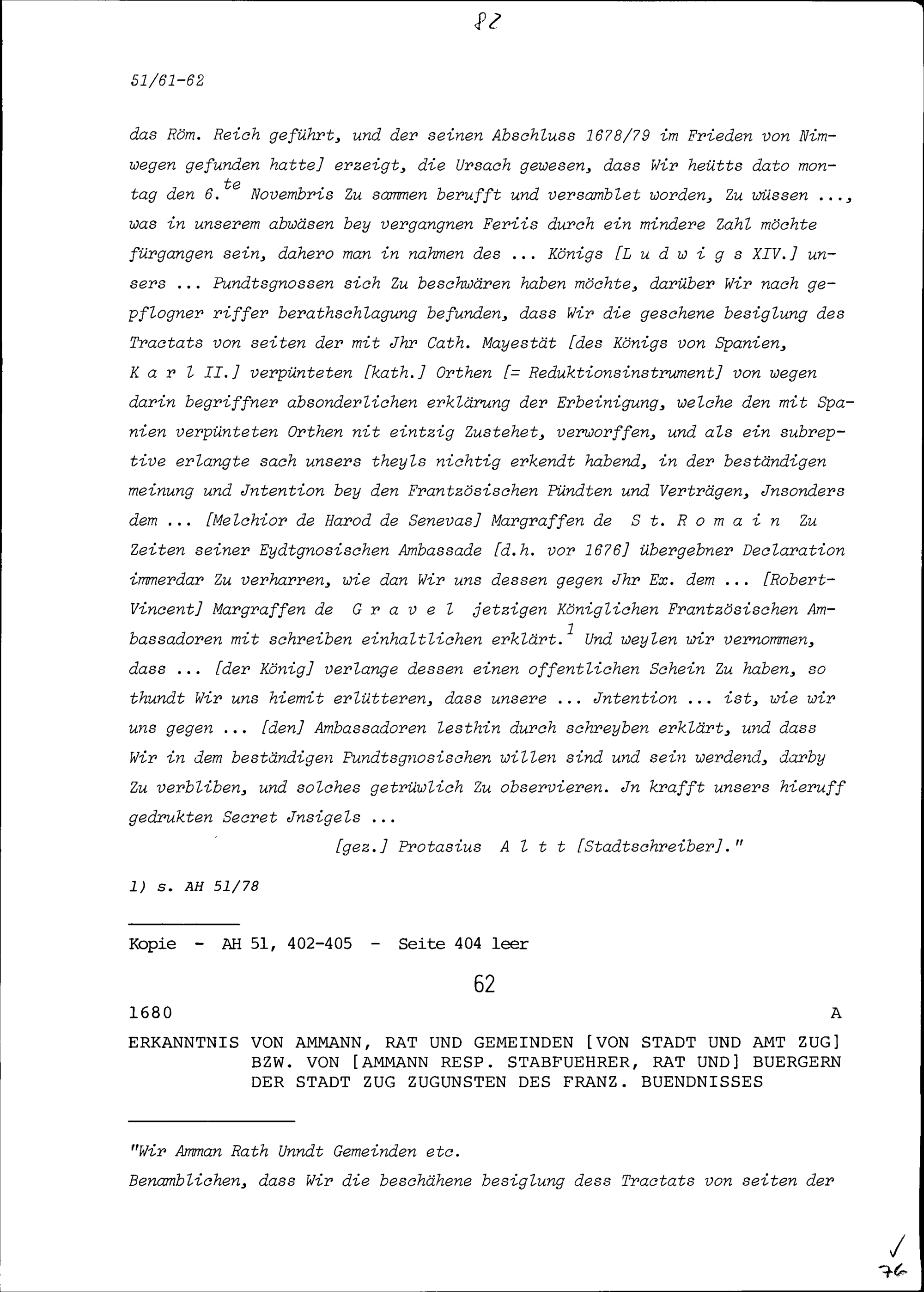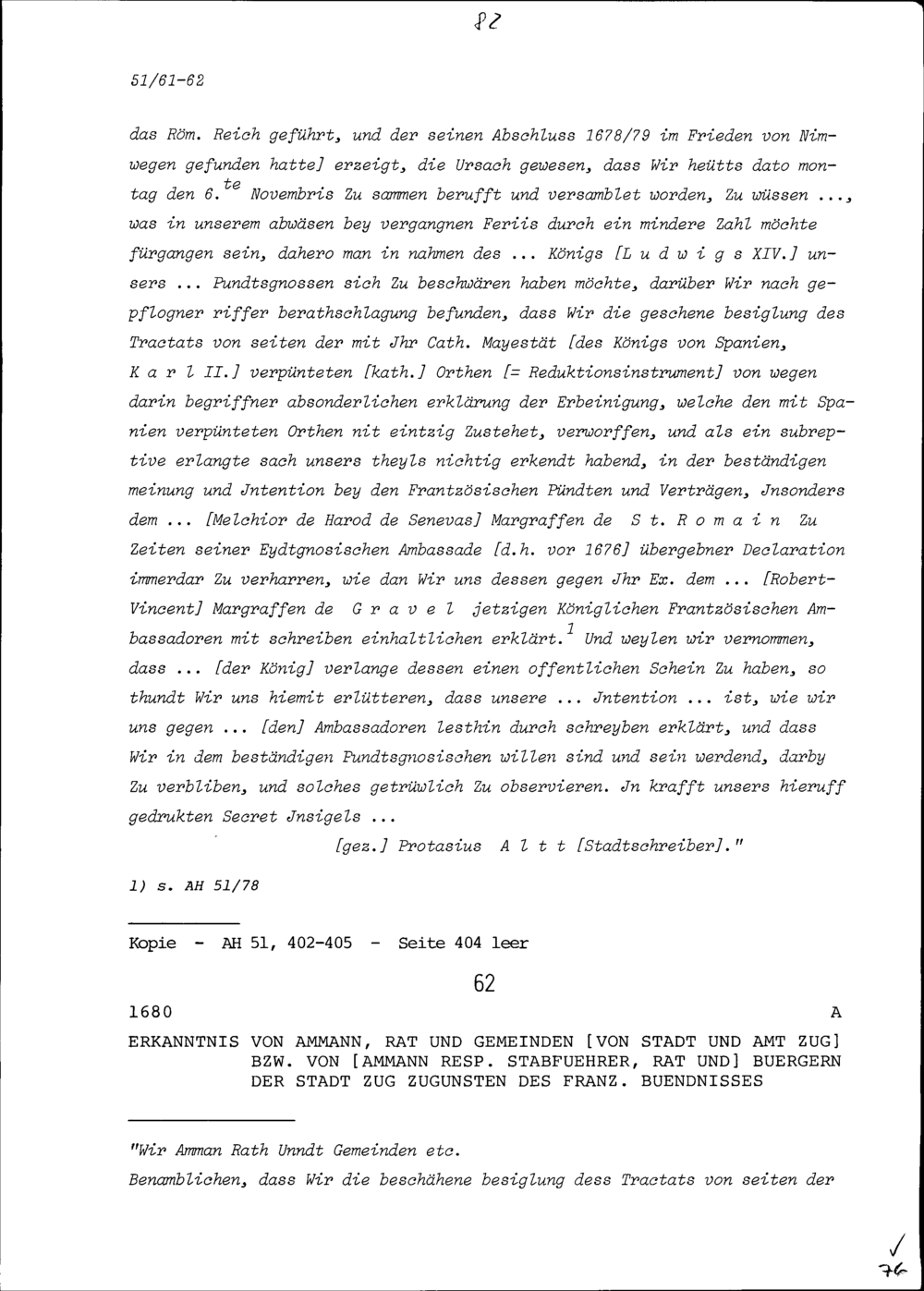 Beschluss des Ammanns, Rats und der Gemeinden von Stadt und Amt Zug beziehungsweise des Ammanns (Stabführers), Rats und der Bürger der Stadt Zug zugunsten des französischen Bündnisses