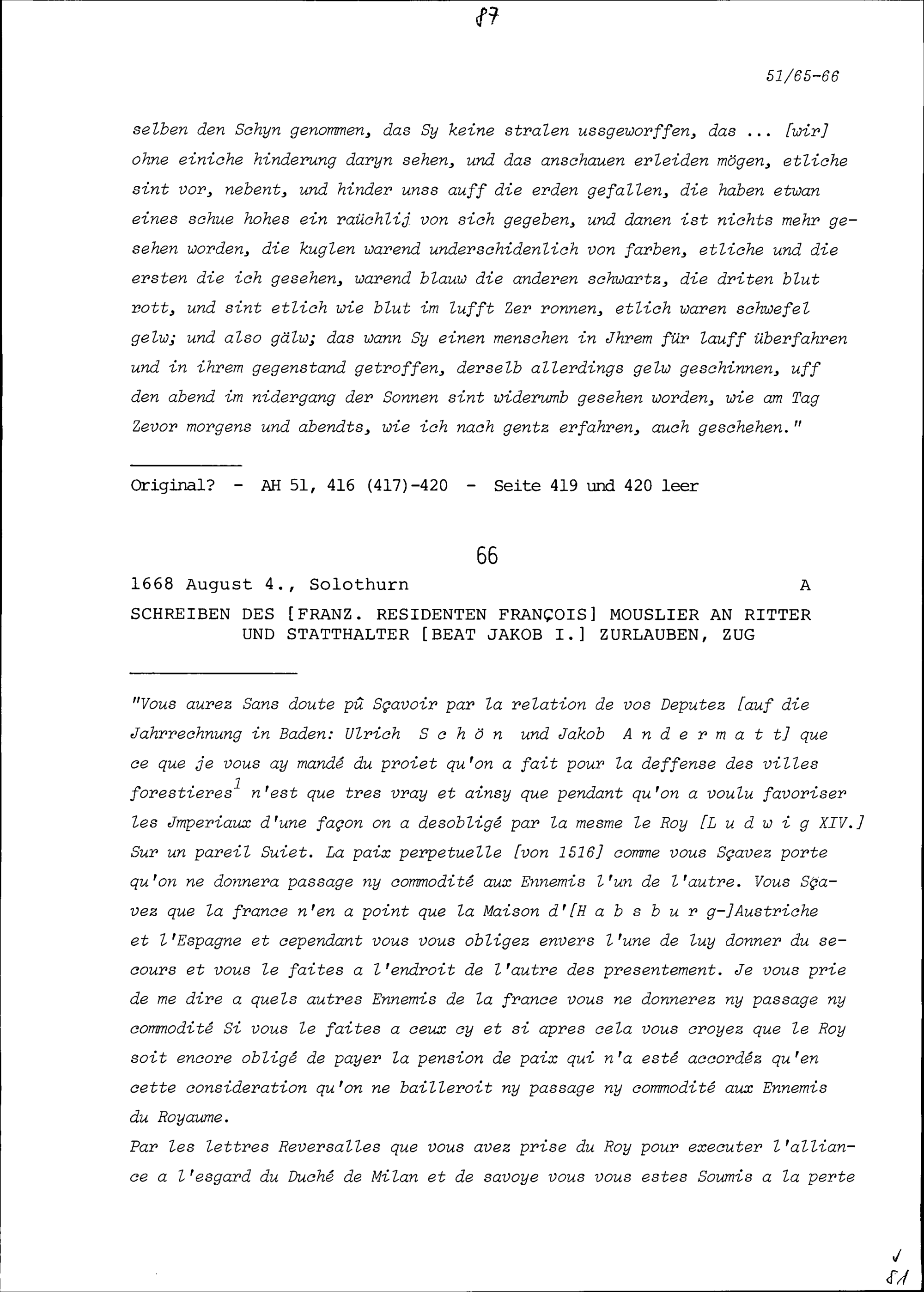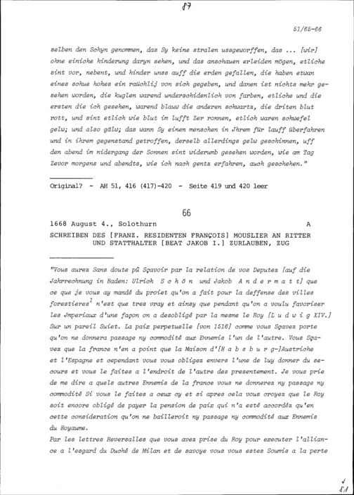 Schreiben von François Mouslier, Resident von Frankreich, an Beat Jakob I. Zurlauben, Statthalter, Zug