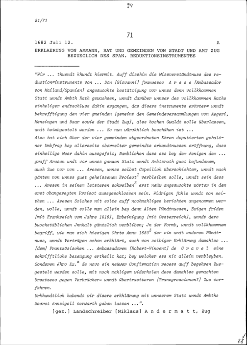 Erklärung des Ammanns, Rats und der Gemeinden von Stadt und Amt Zug bezüglich des spanischen Reduktionsinstruments