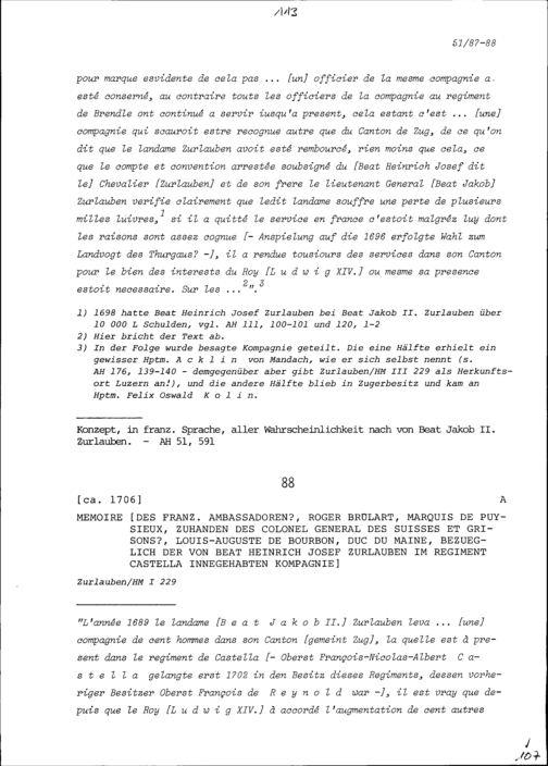 Notiz von Roger Brûlart Marquis de Puysieux, Ambassador von Frankreich, zuhanden von Louis-Auguste de Bourbon, Duc du Maine, Kommandant des Regiments der Schweizer und Bündner Garden, bezüglich der von Beat Heinrich Josef Zurlauben im Regiment Castella besessenen Kompanie