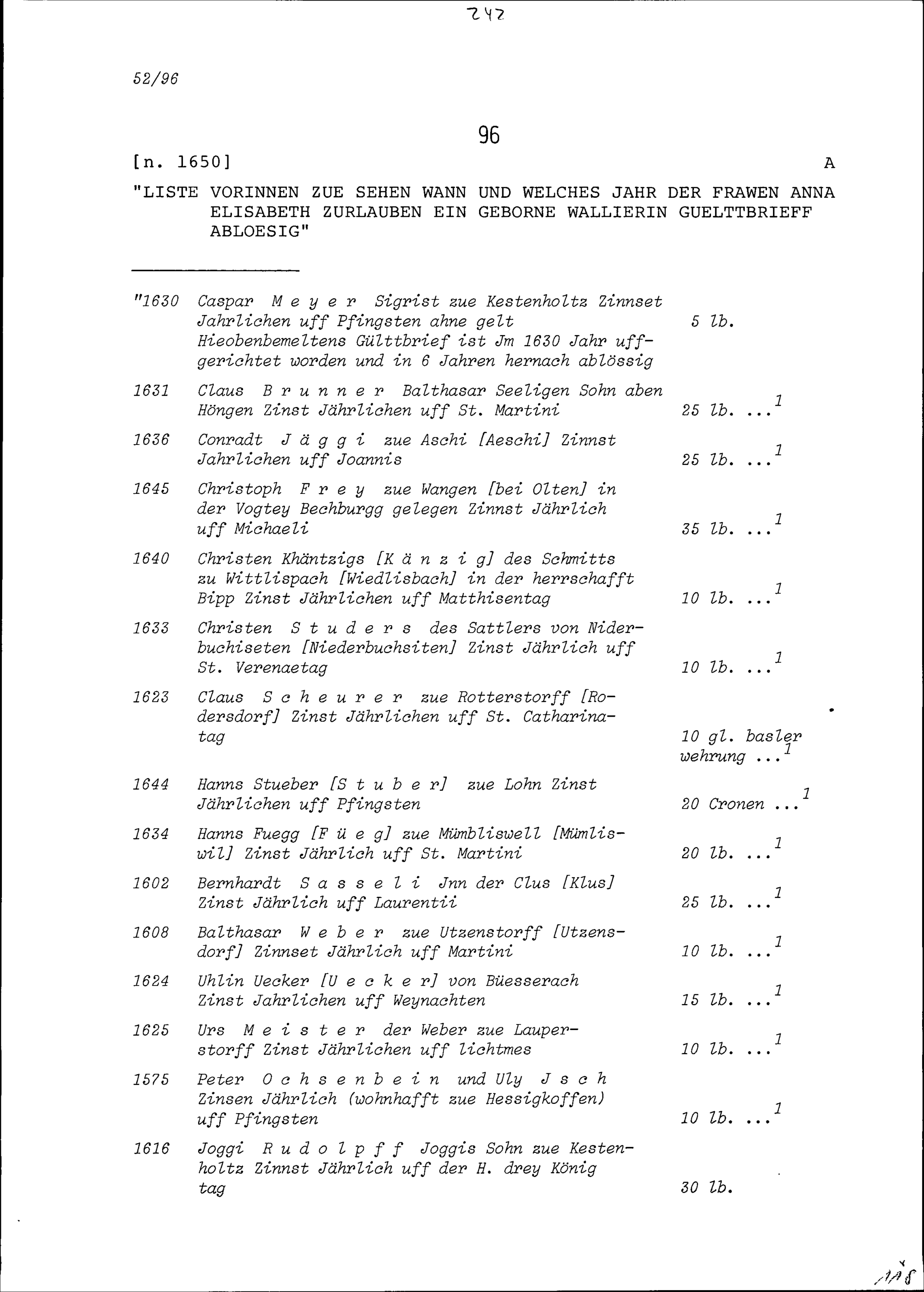 Gültbriefe von Anna Elisabeth Zurlauben, geborene Wallier