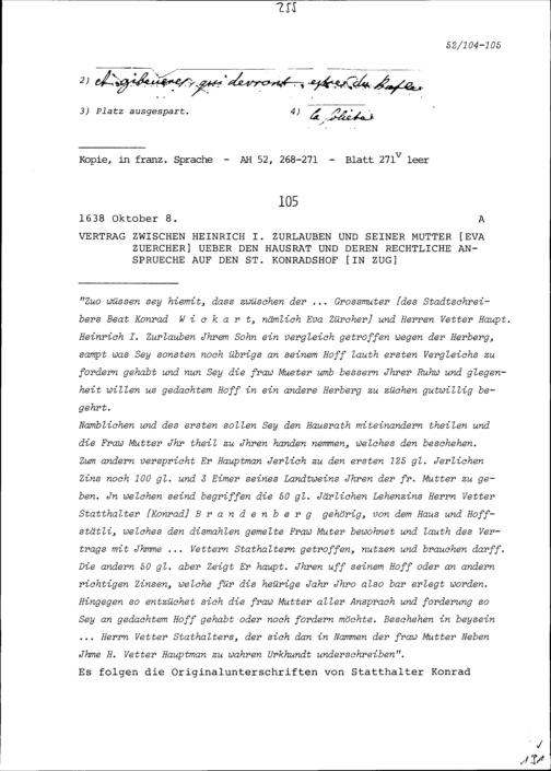 Vertrag zwischen Heinrich I. Zurlauben und Eva Zürcher, seiner Mutter, über den Hausrat und deren rechtliche Ansprüche auf den Sankt Konradshof in Zug