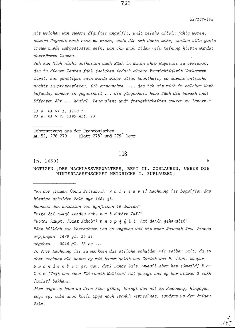 Notiz von Beat II. Zurlauben, Nachlassverwalter, über die Hinterlassenschaft von Heinrich I. Zurlauben
