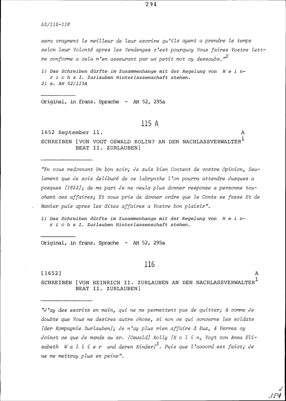 Schreiben von Oswald Kolin, Vogt, an Beat II. Zurlauben, Nachlassverwalter