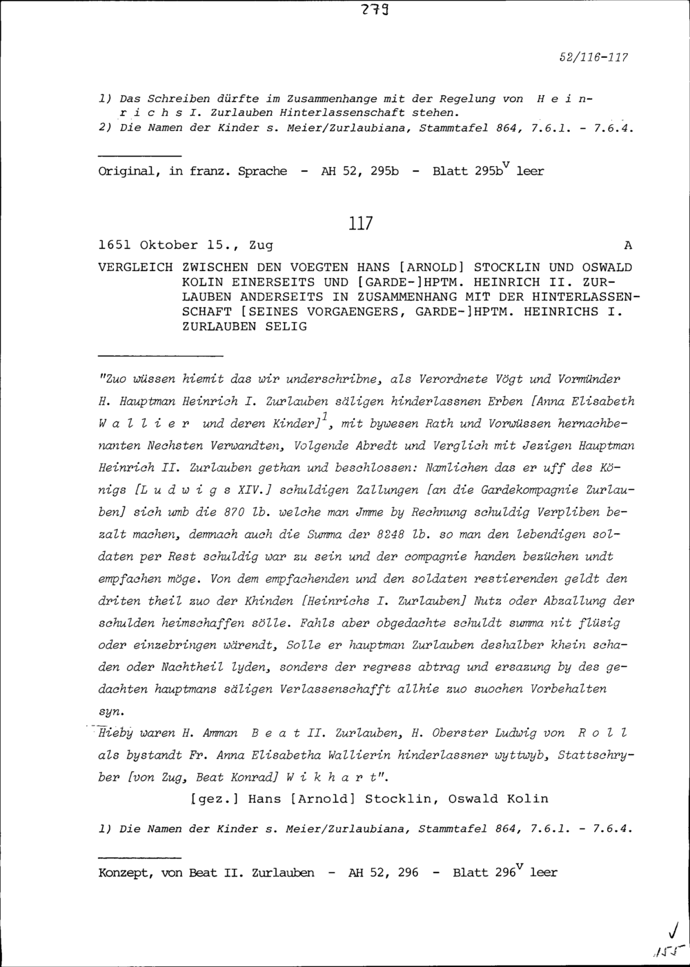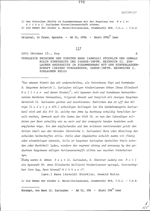 Vergleich zwischen Hans Arnold Stocklin, Vogt, und Oswald Kolin, Vogt, einerseits und Heinrich II. Zurlauben, Gardehauptmann, anderseits in Zusammenhang mit der Hinterlassenschaft von Heinrich I. Zurlauben, selig, Gardehauptmann sein Vorgänger