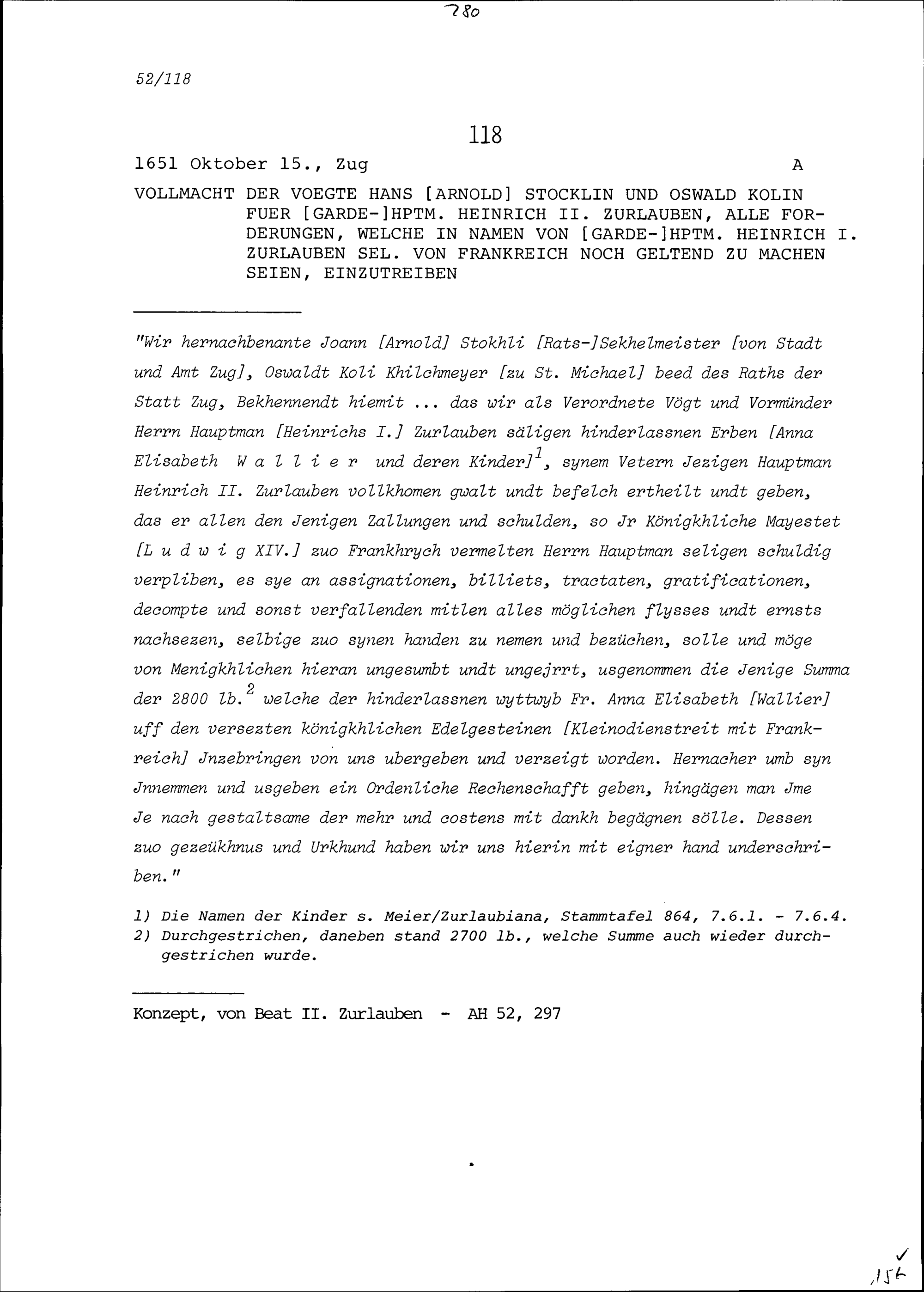 Vollmacht den Hans Arnold Stocklin, Vogt, und Oswald Kolin, Vogt, für Heinrich II. Zurlauben, Gardehauptmann, alle Forderungen, welche in Namen von Heinrich I. Zurlauben, Gardehauptmann, selig, von Frankreich noch geltend zu machen seien, einzutreiben