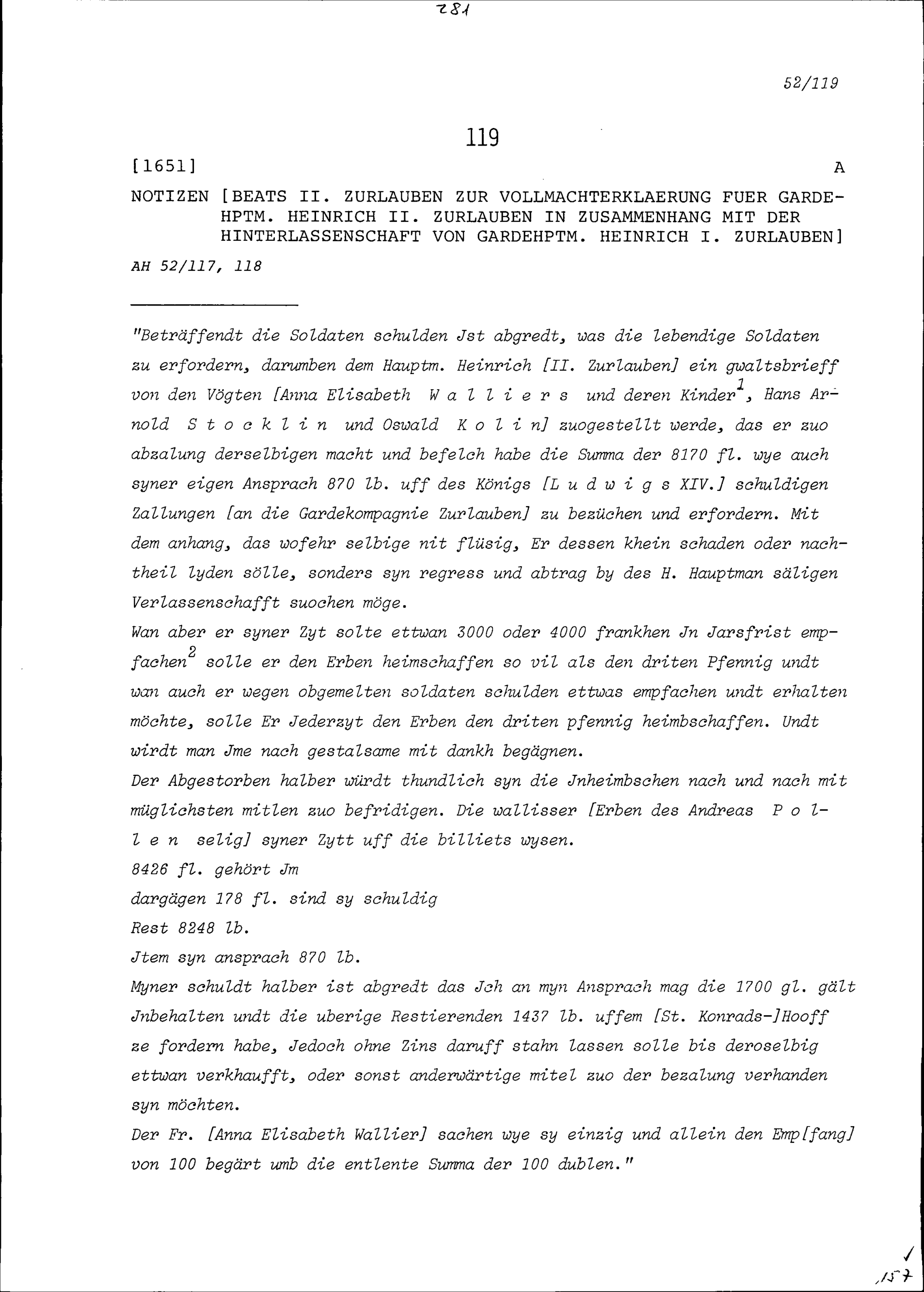 Notiz von Beat II. Zurlauben zur Vollmachterklärung für Heinrich II. Zurlauben, Gardehauptmann,...