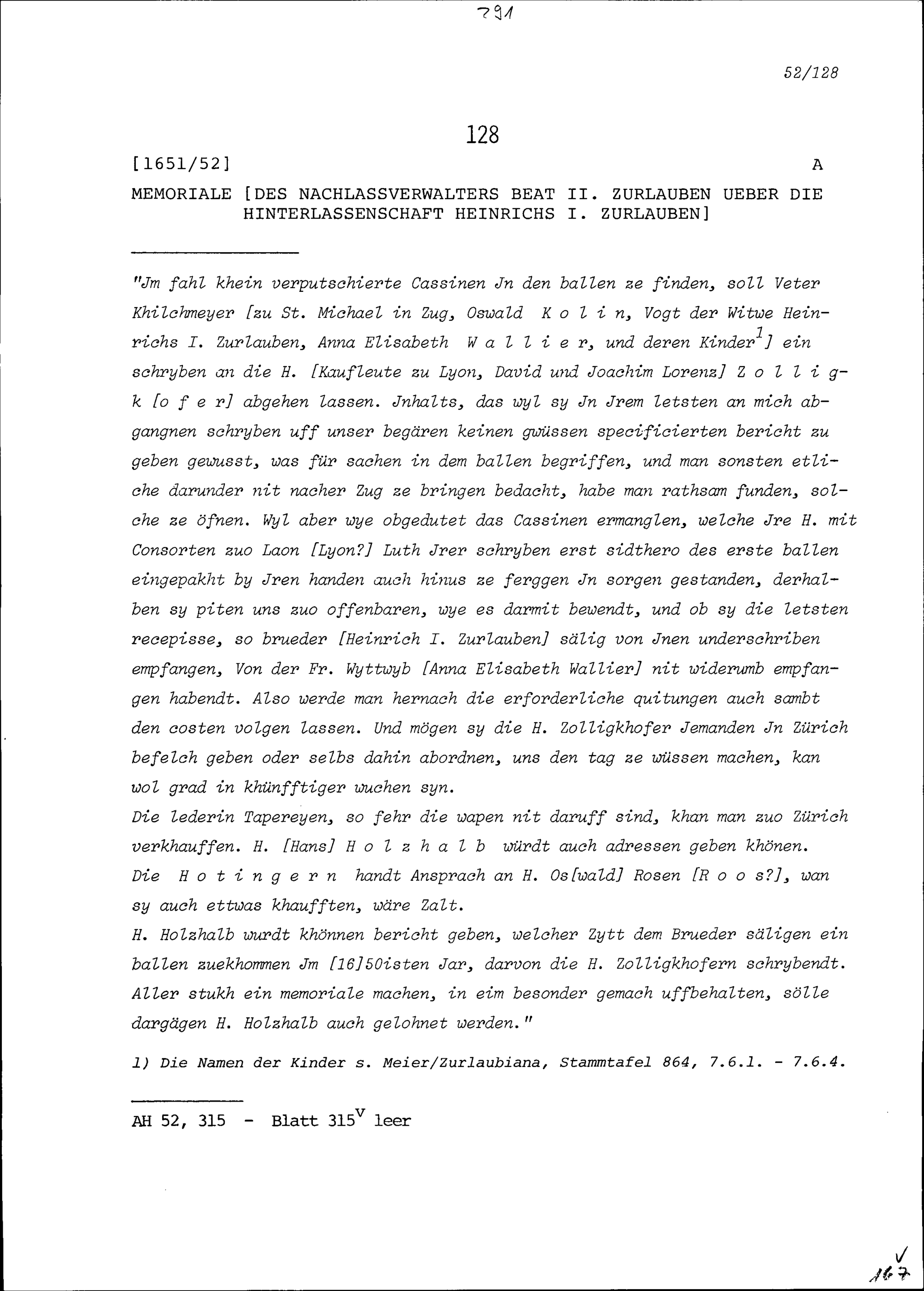 Bericht von Beat II. Zurlauben, Nachlassverwalter, über die Hinterlassenschaft von Heinrich I. Zurlauben