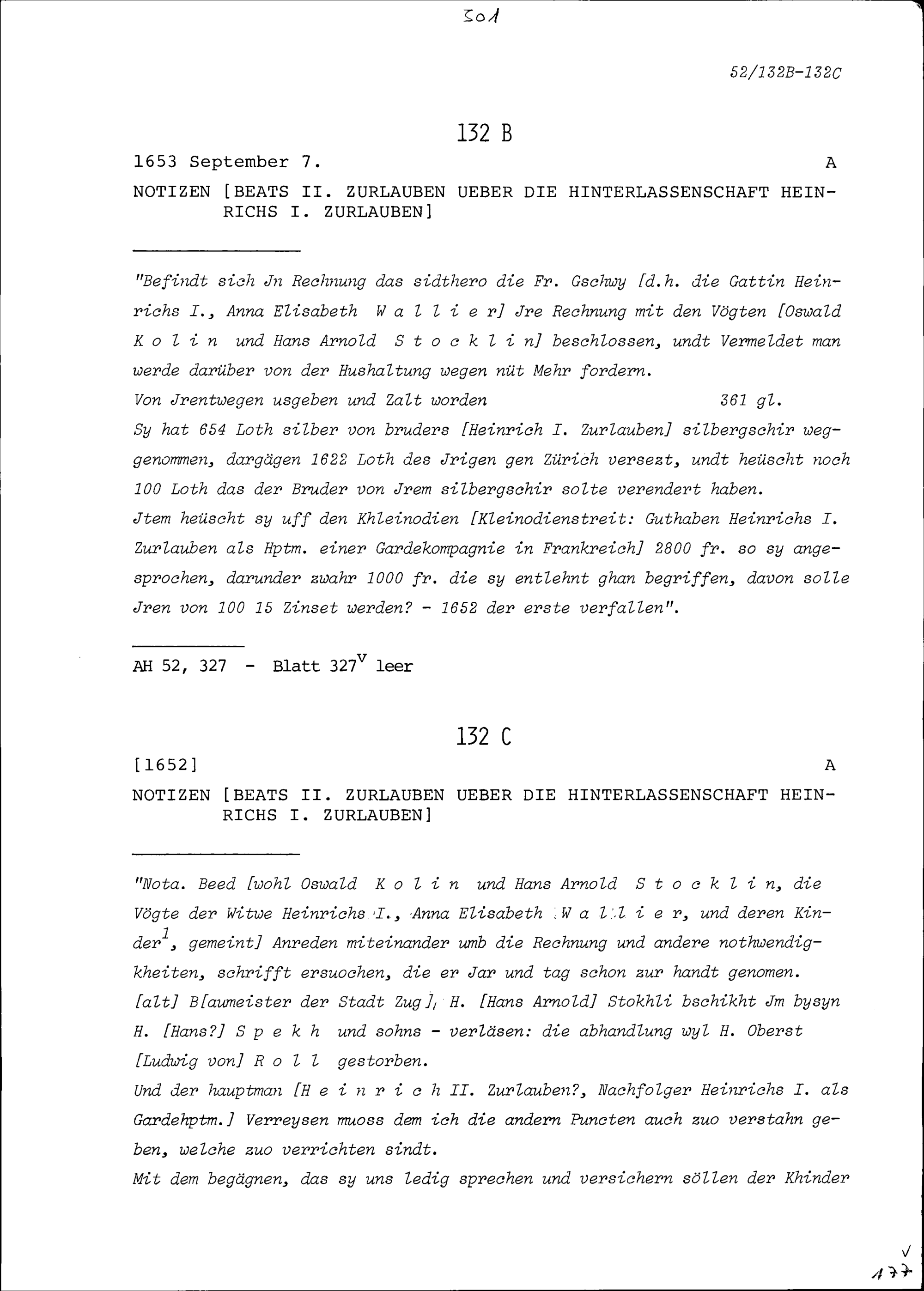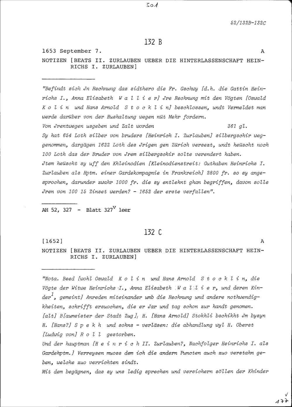 Notiz von Beat II. Zurlauben über die Hinterlassenschaft von Heinrich I. Zurlauben